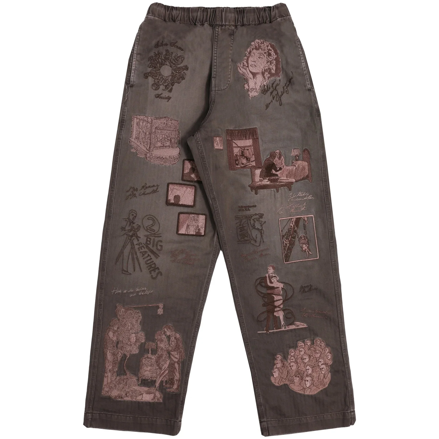 The Film Pant in aubergine by Samuel Zelig is made from 8 oz cotton herringbone with triple needle seams. It features an elastic waistband with an interior cotton drawcord, binding inside the waist, two back pockets with bar tacks, and custom patches. A vintage wash and dye prevent shrinkage and add a sun-faded look.