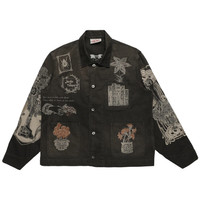 The Jardin Chore Jacket in vintage black by Samuel Zelig is crafted from 8 oz cotton herringbone with triple needle seam construction. It features three front patch pockets reinforced with vertical bar tacks, pointed cuff facings, and Cobrax buttons made in Italy. This jacket has been vintage washed to eliminate shrinkage and achieve a distinctive sun-faded finish.