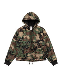 Stussy quilted nylon work jacket in woodland camo with a classic hooded silhouette. Features full insulation, YKK metal zip, drawstring adjustments, and signature "built tough" embroidery. Includes slanted welt pockets, ribbed cuffs, and interior patch pocket for practical storage. Material: 100% nylon Lining: 100% nylon Fill: 100% polyester Imported