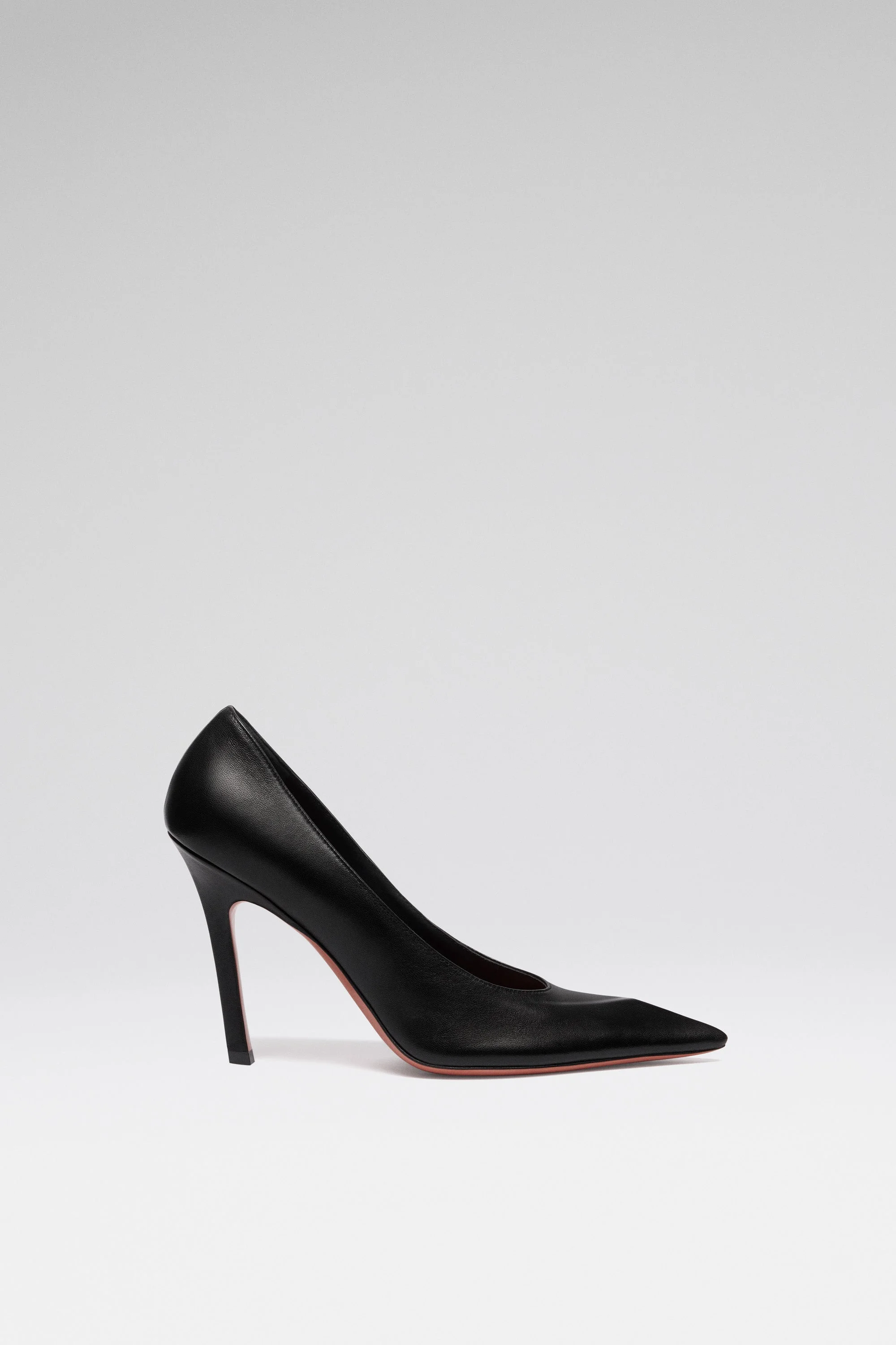 Christine Pump 100 Black Nappa - 100mm Slanted Triangle Heel - Pointed toe design with a triangular accent on top - Fully structured pump design - Fits true to size Composition - Upper: 100% LAMB NAPPA - Lining: 100% KID LINING - Sole: 90% LEATHER AND 10% TPU Origin Made in Italy
