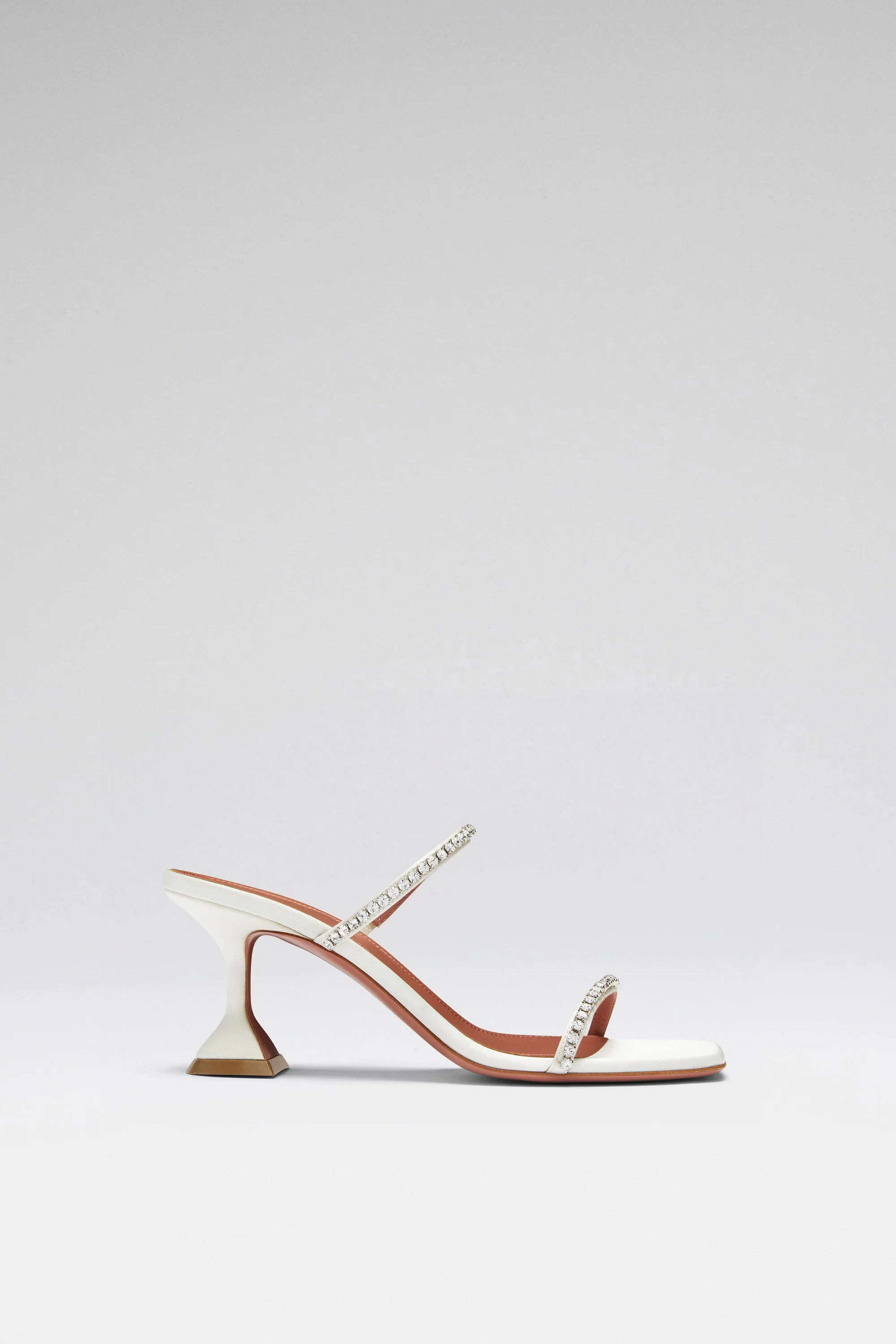 Gilda Slipper 70 White Satin - 70mm CL Heel - Crystal embellished straps - squared toe - Fits true to size Composition - Upper: 100% SILK - Lining: 100% LAMBSKIN - Sole: 70% Leather and 30% Rubber Origin Made in Italy