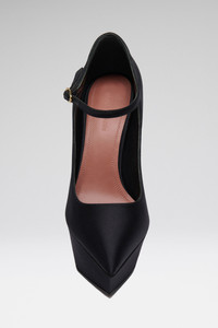 Yigit Pump Black Satin - 150MM TRIANGLE PLATEAU HEEL - Ankle strap - pointed toe - Fits true to size Composition - Upper: 100% Silk - Lining: 100% goat - Sole: 70% Leather and 30% Rubber Origin Made in Italy
