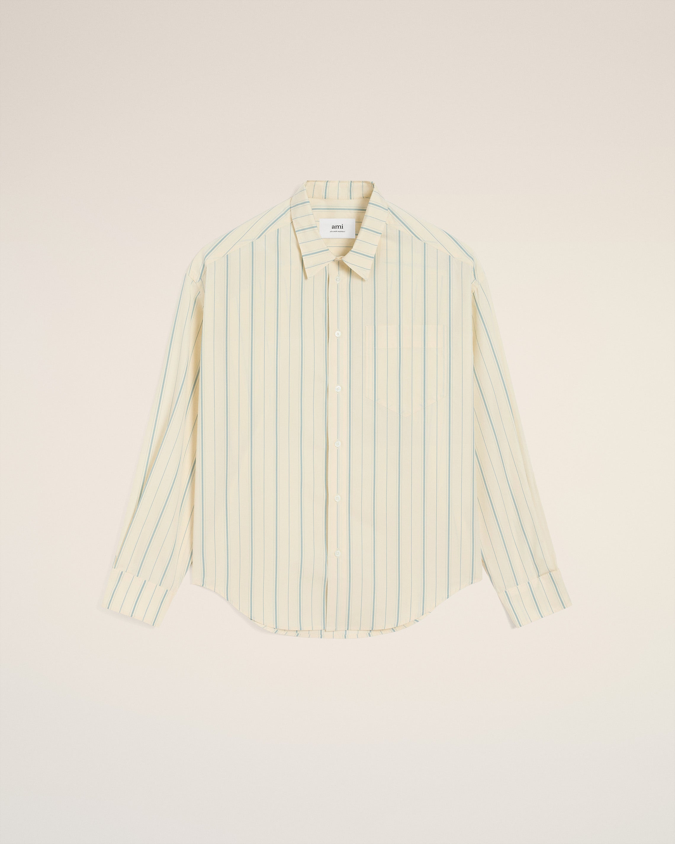 Boxy shirt in fancy stripes cotton poplin. Unisex product Boxy fit Classic collar Chest patch pocket Buttoned front tab and cuffs Mother of pearl buttons "ami alexandre mattiussi" woven label inserted in the left side seam 76,5 cm center back length (size XS) 78,5 cm center back length (size M) Made in Poland (with love) REF: USH773.CO0134.1872 SIZE & FIT This style is unisex. For man, take your normal size. For woman, take one size down than your usual size. Man model is 186 cm / 6"1 and is wearing a size M. Woman model is 178 cm / 5"10 and is wearing a size XS. COMPOSITION & CARE GUIDE Main Material : 100% Cotton Chlorine prohibited Do not tumble dry Dry clean gentle Cool iron Machine wash at 30°c gentle