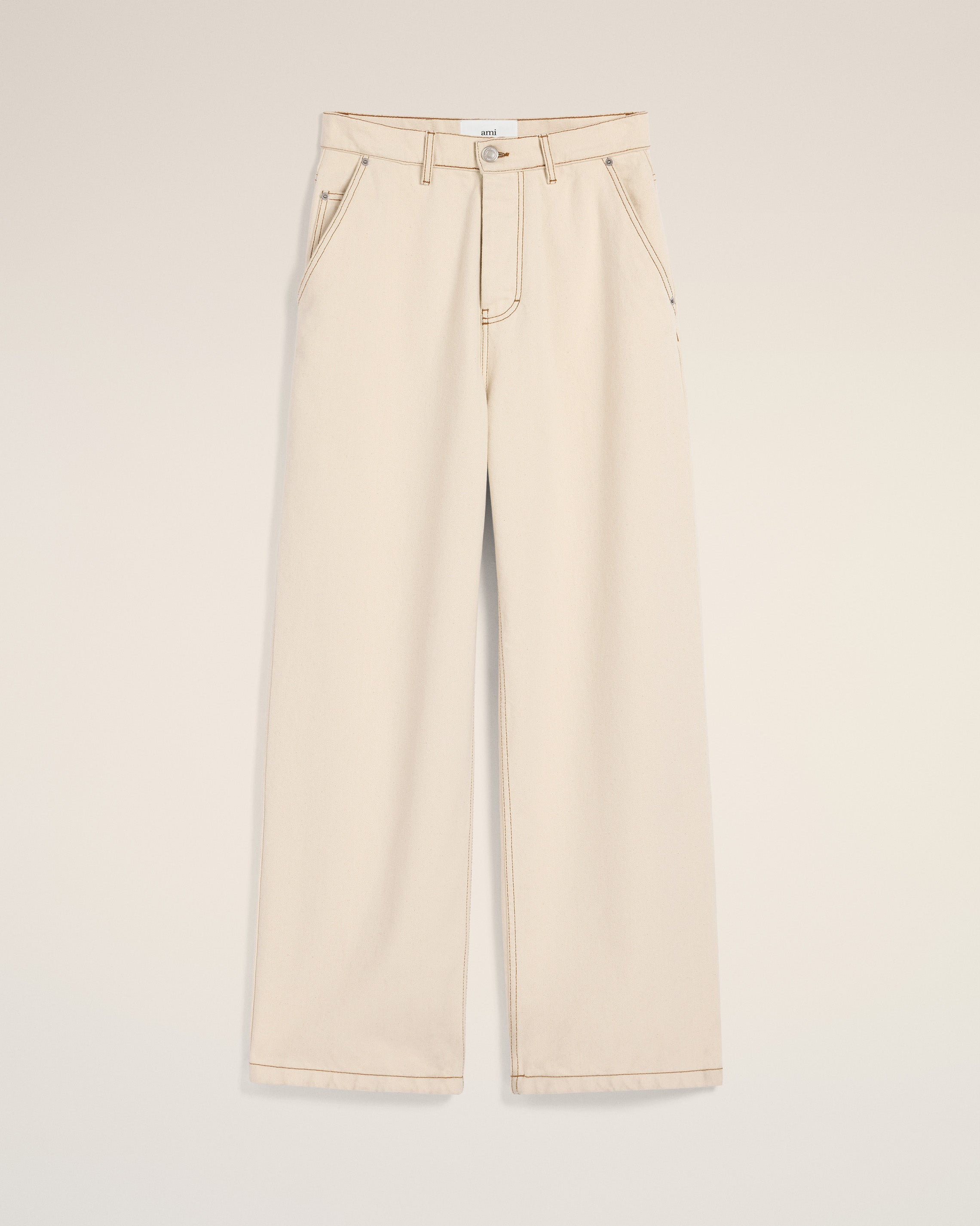 Wide fit jeans in colored cotton twill. Very large fit 31 cm bottom leg width (size 30) Classic waist Very large leg Five pockets Buttoned fly Denim metal rivets and buttons in nickel color "ami alexandre mattiussi" patch on the back Tobacco topstitches Made in Portugal (with love) REF: HTR456.DE0039.136 SIZE & FIT This item is designed to be worn lose. Take your normal size. Model is 1m86 / 6'1" and is wearing a size 30. COMPOSITION & CARE GUIDE 100% Cotton Machine wash at 30°C Chlorine prohibited Do not tumble dry Medium iron Dry clean possible Wash with similar colours