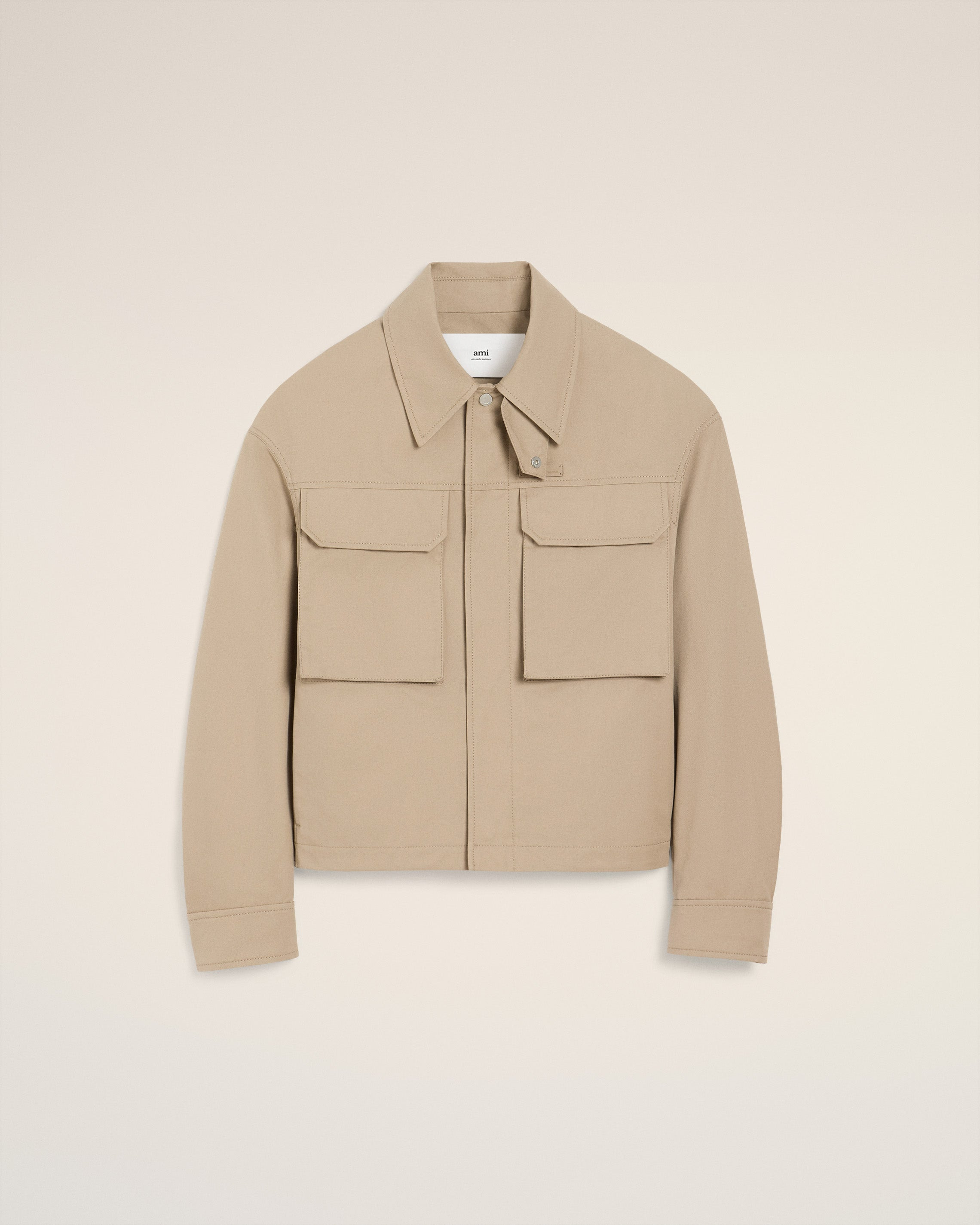 Worker jacket in cotton gabardine. Unisex product Nickel metal zipper with leather puller Front and pockets with invisible snap buttons Adjustable cuffs with snap buttons Adjustable back tabs with snap buttons "ami alexandre mattiussi" leather label on the chest 60 cm center back length (size XS) 62 cm center back length (size M) Made in Romania (with love) REF: UJK846.CO0132.229 SIZE & FIT This style is unisex. For man, take your normal size. For woman, take one size down than your usual size. Man model is 186 cm / 6"1 and is wearing a size M. Woman model is 178 cm / 5"10 and is wearing a size XS. COMPOSITION & CARE GUIDE Main Material : 100% Cotton Pocket Lining : 65% Polyester 35% Cotton Do not wash Chlorine prohibited Do not tumble dry Cool iron Dry clean gentle