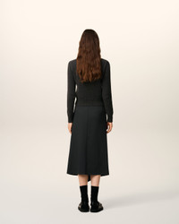 Midi wrap skirt in wool tricotine. Low waist Front closing system with two covered press studs buttons and a hook Welt side pockets Additional front and back panels applied with double topstitching Fully lined Raw edge on skirt panel side and bottom 80cm center back length (size 36) Made in Madagascar (with love) REF: FSK430.WV0067.020 SIZE & FIT Fits true to size. Take your normal size. Model is 181 cm / 5"11 and is wearing a size 36. COMPOSITION & CARE GUIDE Main Material : 100% New Wool Main Lining : 60% Acetate 40% Cupro Do not wash Chlorine prohibited Do not tumble dry Cool iron Dry clean petroleum solvent only on a gentle process