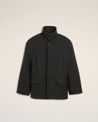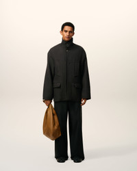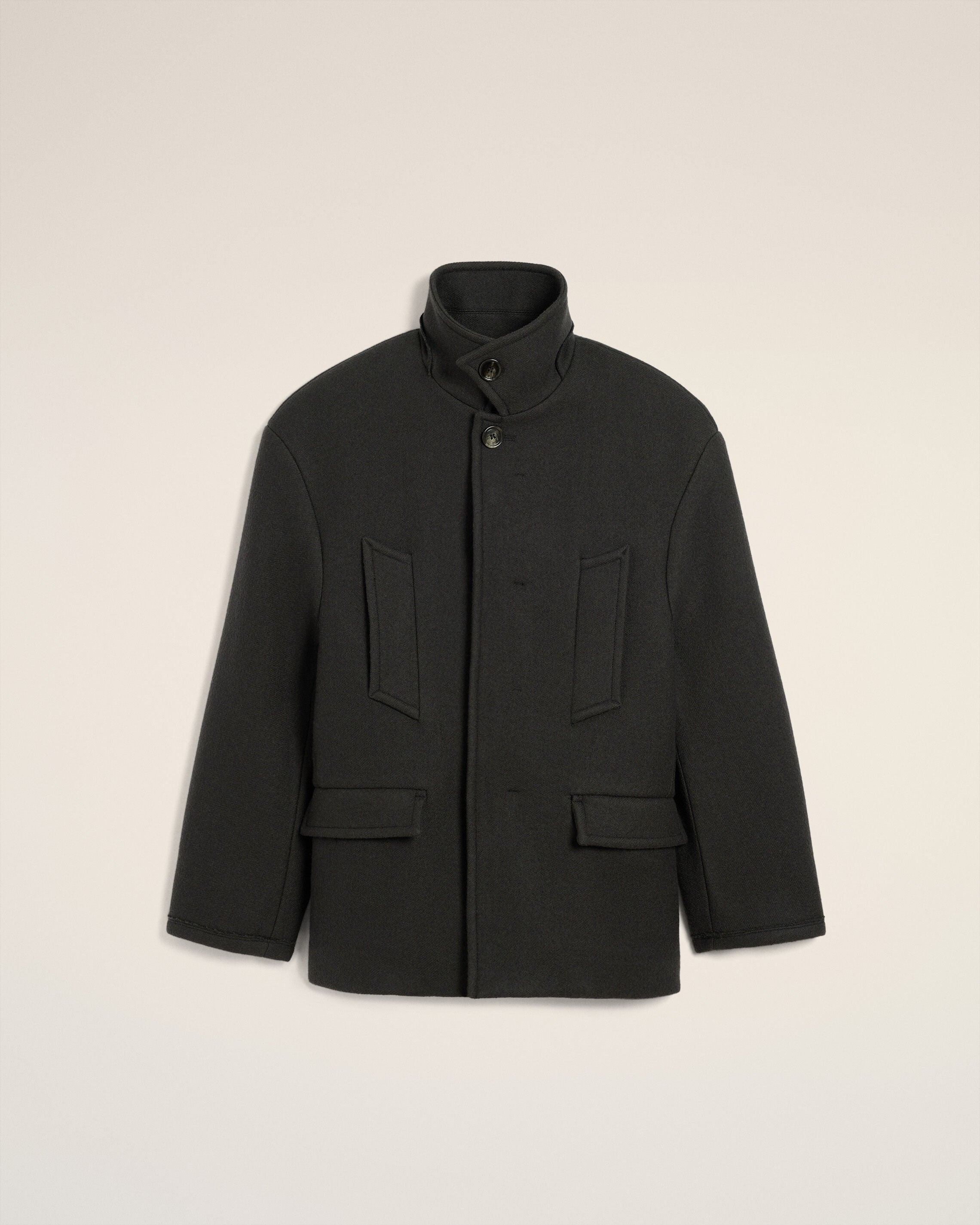 Oversized pea coat with high collar in boiled wool gabardine. Oversized fit Buttoned high collar Horn buttons Single breasted Hidden placket on the front 2 vertical welt pockets 2 bottom flap pockets 3 inside pockets Raw edges finitions on the elbows, cuffs and under collar AMF stitches on the collar, lapel and flap pockets Semi lined 84cm center back length (size 48) Made in Tunisia (with love) REF: HCO456.WV0078.020 SIZE & FIT This item is designed to be worn lose. Take your normal size. Model is 187 cm / 6"2 and is wearing a size 48. COMPOSITION & CARE GUIDE Main Material : 100% New Wool Main Lining : 50% Polyester 50% Cotton Pocket Lining : 65% Polyester 35% Cotton Do not wash Chlorine prohibited Do not tumble dry Cool iron Dry clean gentle