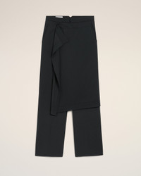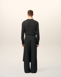 Large fit trousers with panel in wool tricotine. Wide fit Zipped front fly Horn buttons Back welt pockets with buttons "ami" waistband V cut detail on the back belt Front panel with covered press button closure system Front lining to knees 23 cm bottom leg width (size 40) Made in Romania (with love) REF: HTR809.WV0067.020 SIZE & FIT This item is designed to be worn lose. Take your normal size. Model is 183 cm / 6"0 and is wearing a size 40. COMPOSITION & CARE GUIDE Main Material : 100% New Wool Main Lining : 50% Polyester 50% Cotton Pocket Lining : 100% Cotton Do not wash Chlorine prohibited Do not tumble dry Cool iron Dry clean petroleum solvent only on a gentle process