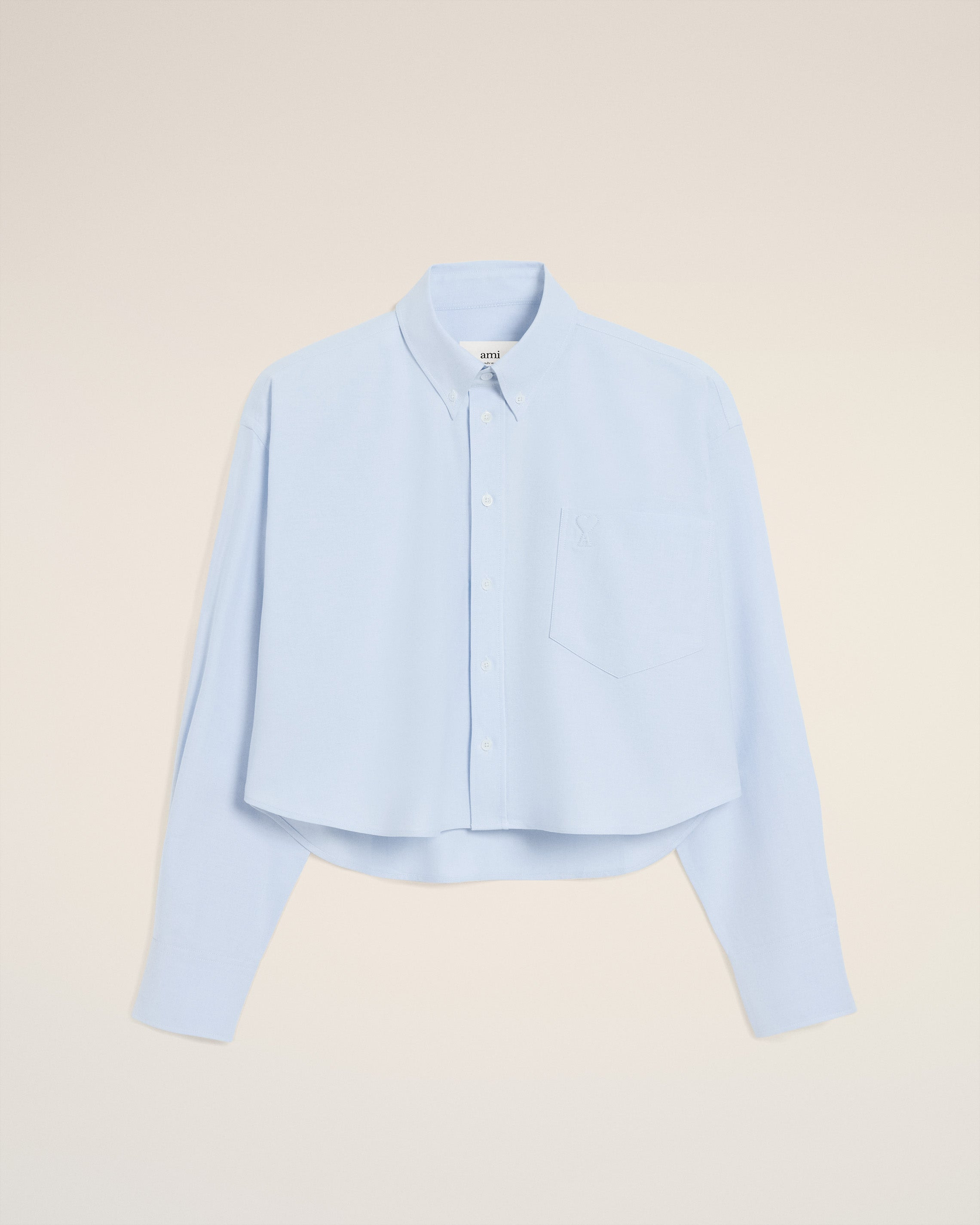 Button down cropped oversized shirt in cotton Oxford. Cropped oversized fit Button down collar Buttoned tab on frond and cuffs Mother of pearl buttons Patch pocket Embossed and topstitched Ami de Coeur on pocket 58 cm center back length (size 36) Made in Portugal (with love) REF: FSH770.CO0031.450 SIZE & FIT This item is designed to be worn lose. Take your normal size. Model is 178 cm / 5"10 and is wearing a size 36. COMPOSITION & CARE GUIDE Main Material : 100% Cotton Chlorine prohibited Do not tumble dry Dry clean gentle Cool iron Machine wash at 30°c gentle