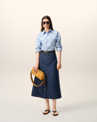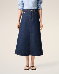 Long skirt in raw indigo denim. Low rise Zipped fly Denim metal rivets and buttons in nickel color ami alexandre mattiussi paper jacron on the back Tobacco topstitches Made in Portugal (with love) REF: FSK467.DE0122.402 SIZE & FIT Fits true to size. Take your normal size. Woman model is 181 cm / 5"9 and is wearing a size S. COMPOSITION & CARE GUIDE Main Material : 100% Cotton Pocket Lining : 100% Cotton Machine Wash At 30°C Chlorine Prohibited Do Not Tumble Dry Medium Iron Dry Clean Possible Wash With Similar Colours Wash And Iron Inside Out