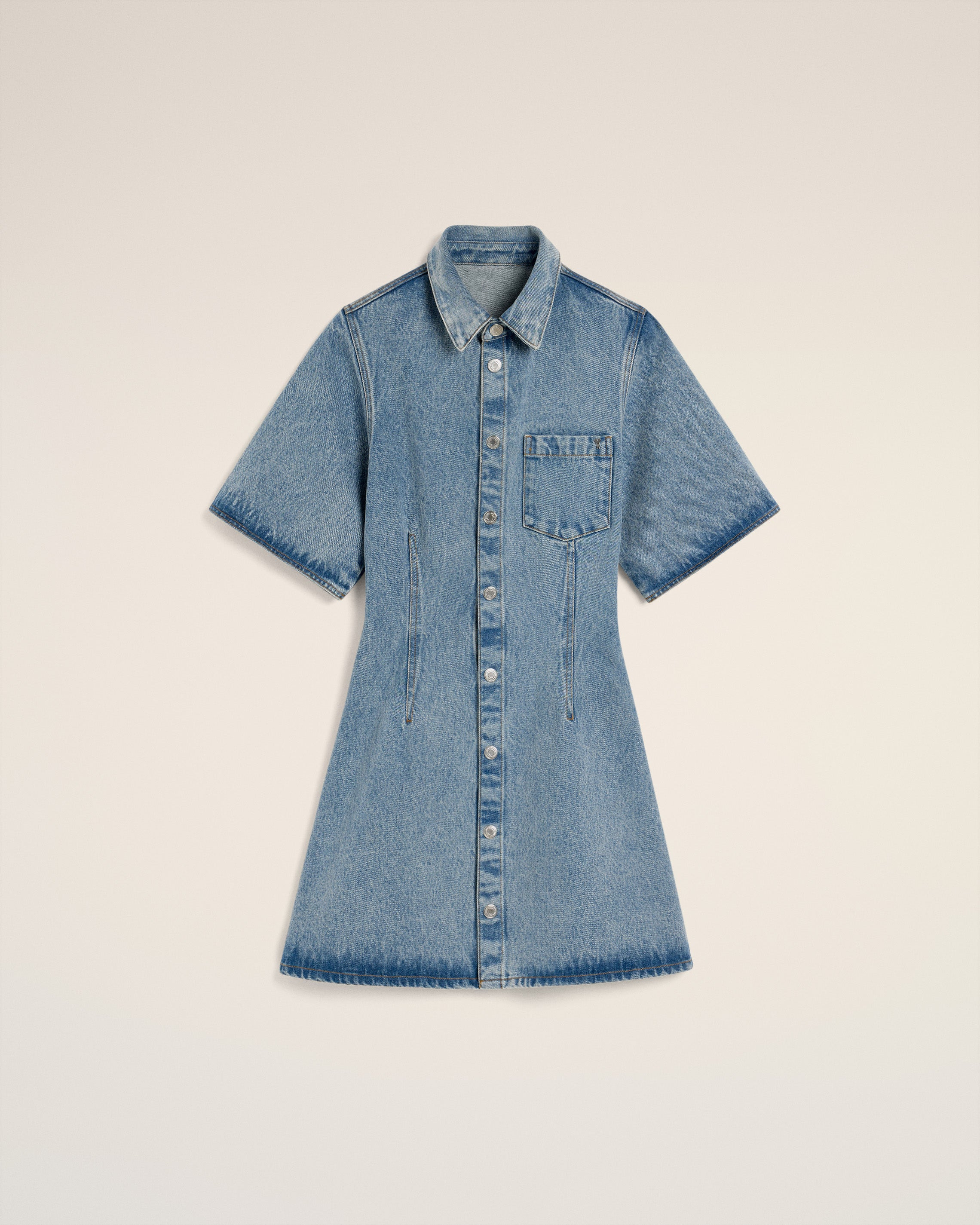 Short sleeve shirt dress in used indigo denim. Fitted fit 87 cm center back length (size S) Chest pocket Ami de Coeur rivet on chest pocket Denim snap buttons in nickel color Tobacco topstitches Made in Portugal (with love) REF: FDR404.DE0046.480 SIZE & FIT Fits true to size. Take your normal size. Model is 1m74 / 5'9" and is wearing a size XS. COMPOSITION & CARE GUIDE 100% Cotton Machine wash at 30°C Chlorine prohibited Do not tumble dry Medium iron Dry clean possible
