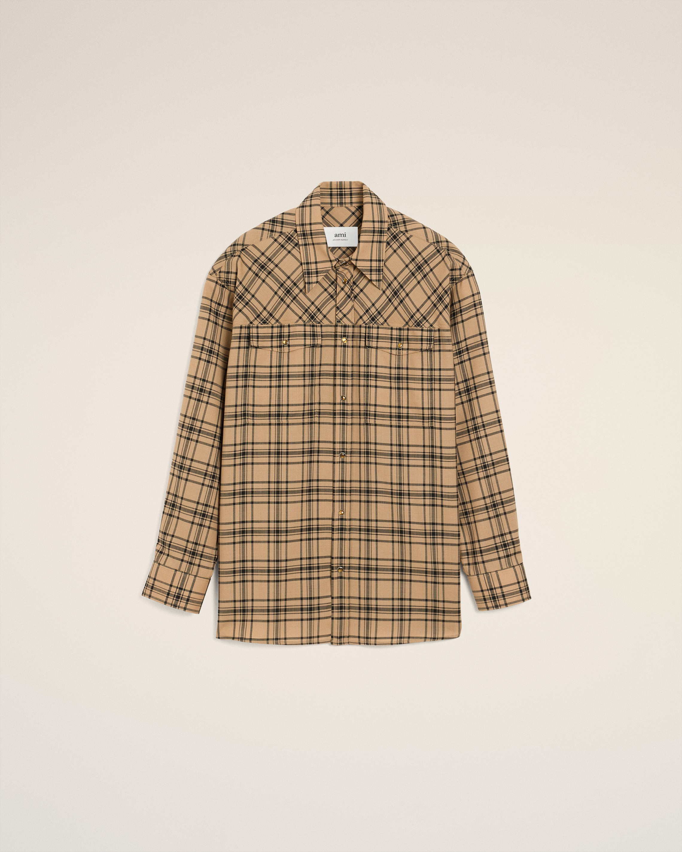 Long sleeves shirt in checked wool twill. Unisex product Relaxed fit Checked Classic collar 2 front pockets Western snap buttons on front and cuffs Branded horizontal silver metal placket Center back length: 83 cm (size XS) Center back length: 84 cm (size M) Made in Bulgaria (with love) REF: USH777.WO0011.288 SIZE & FIT This style is unisex. For man, take your normal size. For woman, take one size down than your usual size. Man model is 186 cm / 6"1 and is wearing a size M. Woman model is 181 cm / 5"11 and is wearing a size XS. COMPOSITION & CARE GUIDE Main Material : 50% Wool 50% Polyester Chlorine prohibited Do not tumble dry Dry clean gentle Cool iron Machine wash at 30°c gentle