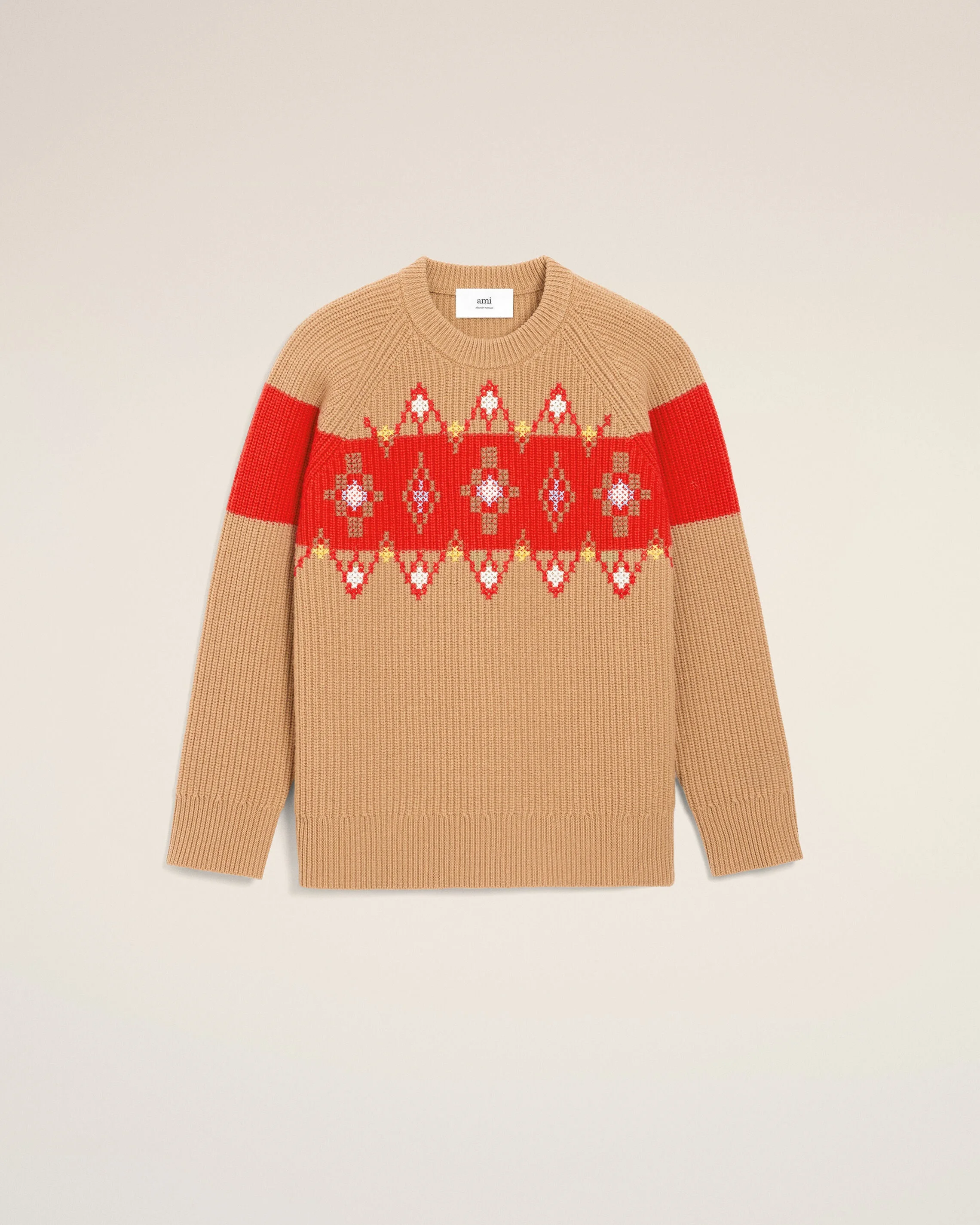 Round collar sweater in wool knit. Limited Edition - Ami Holidays Capsule Unisex product Cross stitch pattern Crewneck Half cardigan rib stitch Cross stitch embroidery on the front "ami" embossed leather label 76 cm center back length (size M) 72 cm center back length (size XS) Made in Italy (with love) REF: UKS842.KN0137.2801 SIZE & FIT This style is unisex and it's design to be worn oversize. Take your normal size. Woman model is 181 cm / 5"9 and is wearing a size XS. Man model is 182 cm / 5"9 and is wearing a size M. COMPOSITION & CARE GUIDE Main Material : 100% Wool Chlorine prohibited Do not tumble dry Dry clean possible Cool iron Dry flat Contains non-textile parts of animal origin Hand wash low temperature Wash with similar colours