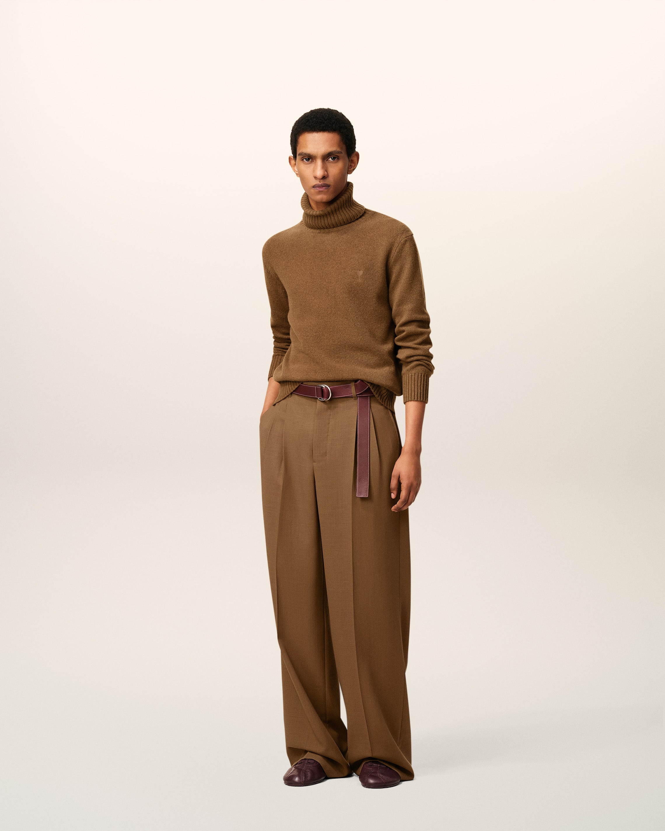 Low waist two pleats wide trousers in wool tricotine. Wide fit Low waist Zipped fly Horn buttons Buttoned back pockets "ami" waistband 2 adjustable tabs on side with metal buckle engraved ami V detail on the back Front pleats Front lining to knees 31 cm bottom leg width (size 40) Made in Romania (with love) REF: HTR812.WV0066.216 SIZE & FIT This item is designed to be worn lose. Take your normal size. Model is 187 cm / 6"2 and is wearing a size 40. COMPOSITION & CARE GUIDE Main Material : 100% New Wool Main Lining : 100% Polyester Pocket Lining : 65% Polyester 35% Cotton Do not wash Chlorine prohibited Do not tumble dry Cool iron Dry clean gentle