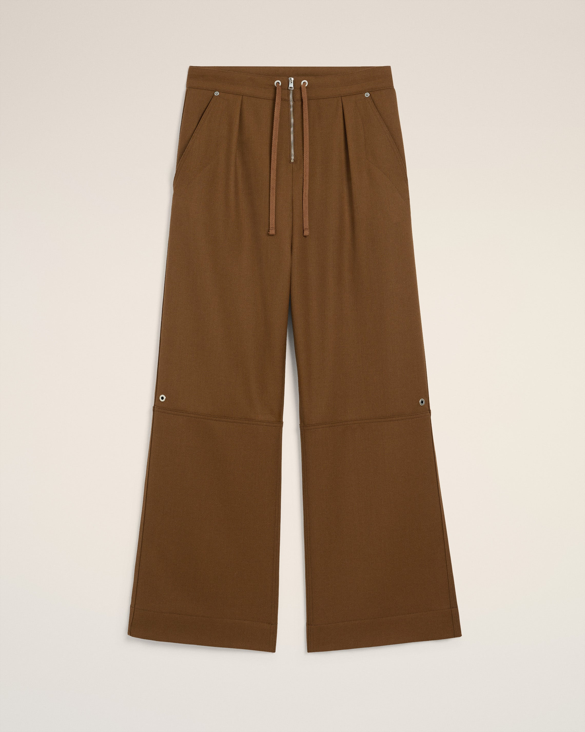 Zipped trousers in wool gabardine. Wide fit Visible zipped fly Pockets with invisible snap buttons "ami alexandre mattiussi" leather label on the back Drawstrings at the belt Details with metal eyelets and studs 33 cm bottom leg width (size M) Made in Portugal (with love) REF: HTR832.WV0088.216 SIZE & FIT This item is designed to be worn lose. Take your normal size. Model is 187 cm / 6"2 and is wearing a size M. COMPOSITION & CARE GUIDE Main Material : 100% New Wool Pocket Lining : 65% Polyester 35% Cotton Do not wash Chlorine prohibited Do not tumble dry Cool iron Dry clean gentle Contains non-textile parts of animal origin