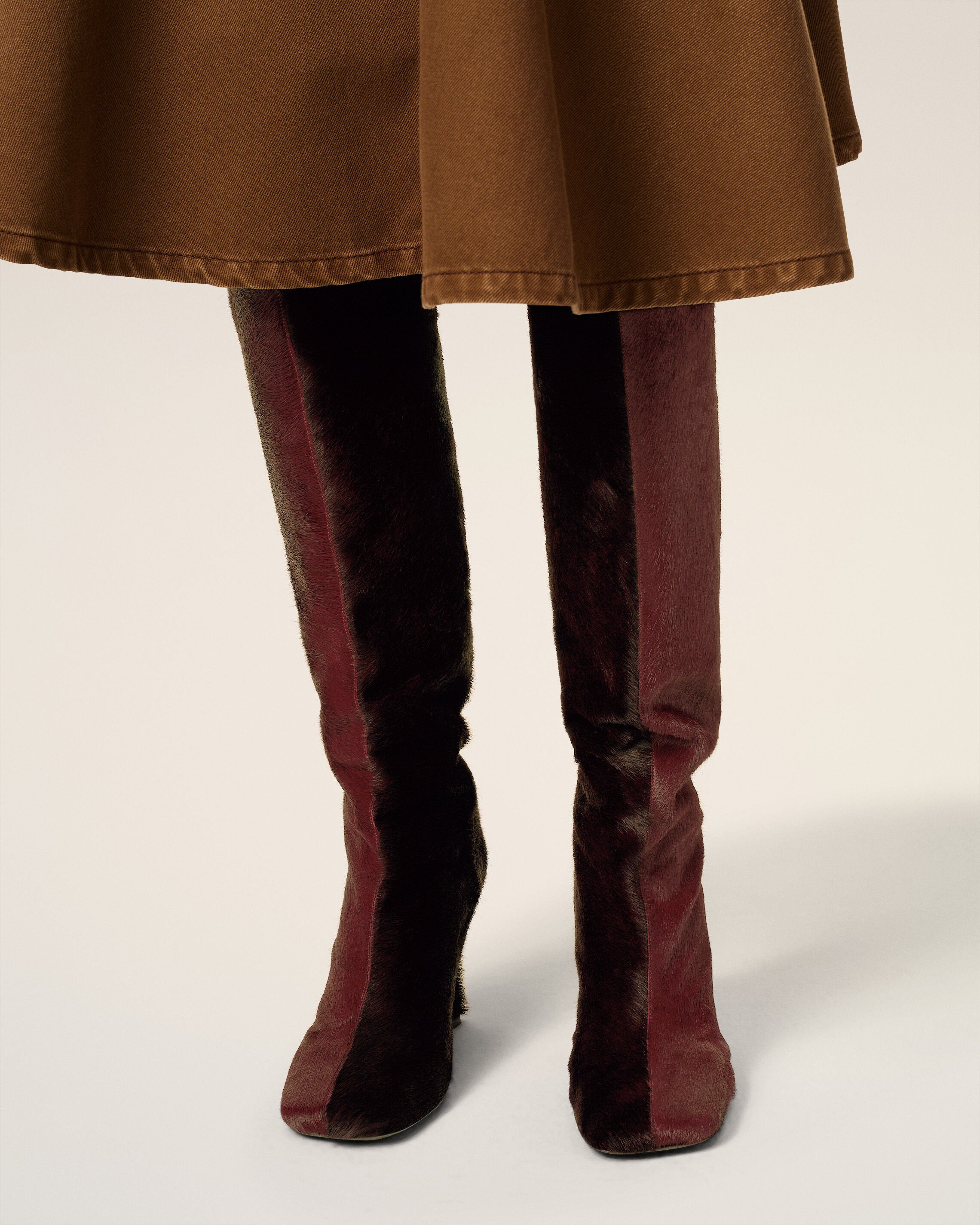 Bicolor wedge knee high boots in poney effect cow leather. Cow leather Tonal leather sole Signature wedge heel Leather covered bicolor heel Smooth leather lining Ami de Coeur logo on the outsole "ami alexandre mattiussi" label in the insole Total heel height 85mm Made in Portugal (with love) REF: FSV820.AL0120.692 SIZE & FIT Fits true to size. Take your normal size. COMPOSITION & CARE GUIDE Main Material : 100% Cow Leather Secondary Material : 100% Cow Leather Main Lining : 100% Cow Leather Outsole : 100% Cow Leather Do not wash