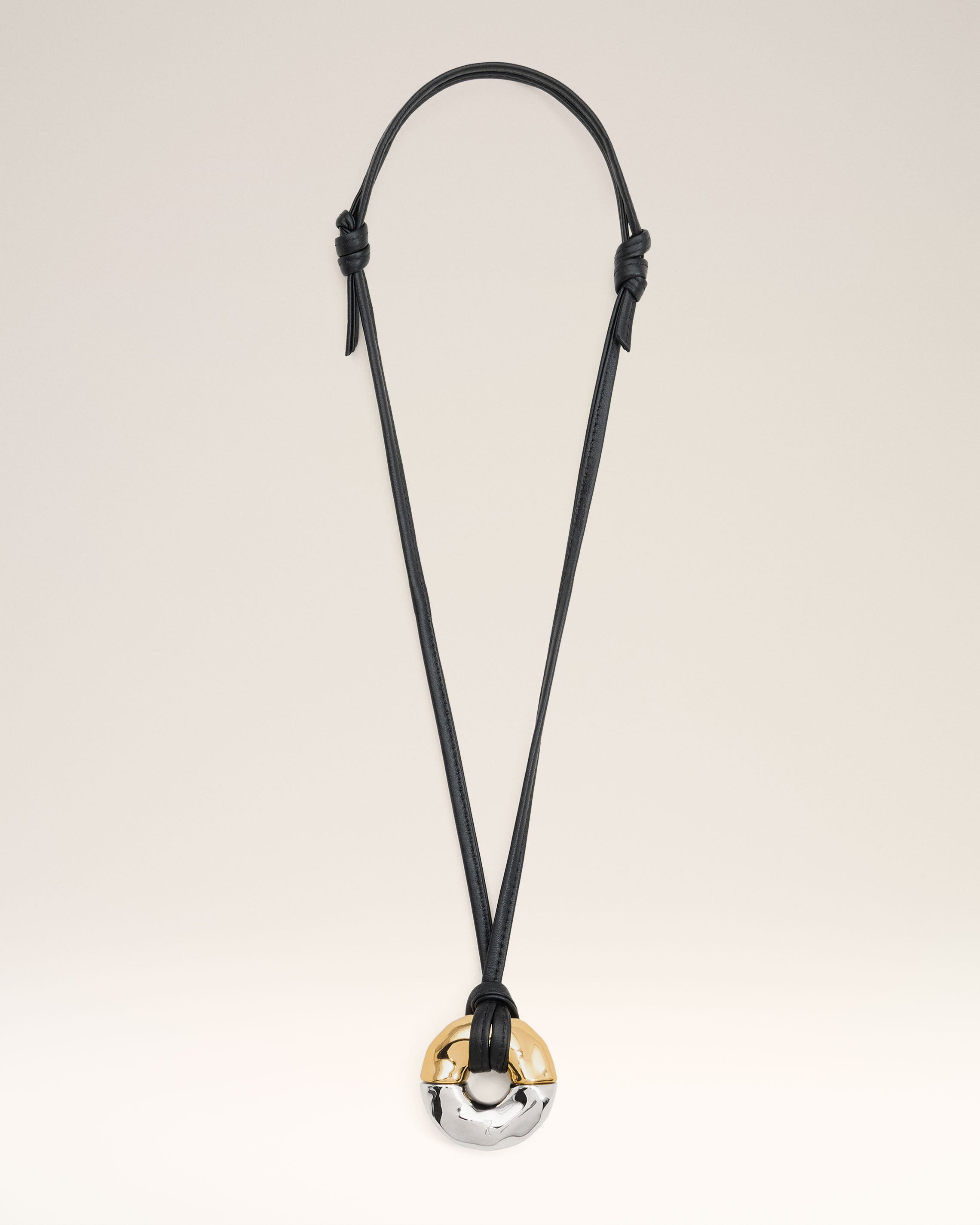 Hammered pendant in palladium-plated brass and gold resin. Engraved Ami de Coeur logo Adjustable leather cord with knots at the top Made in Italy (with love) REF: UJW107.361.903 SIZE & FIT Adjustable leather cord. COMPOSITION & CARE GUIDE 100% Brass Use a soft cloth for cleaning.