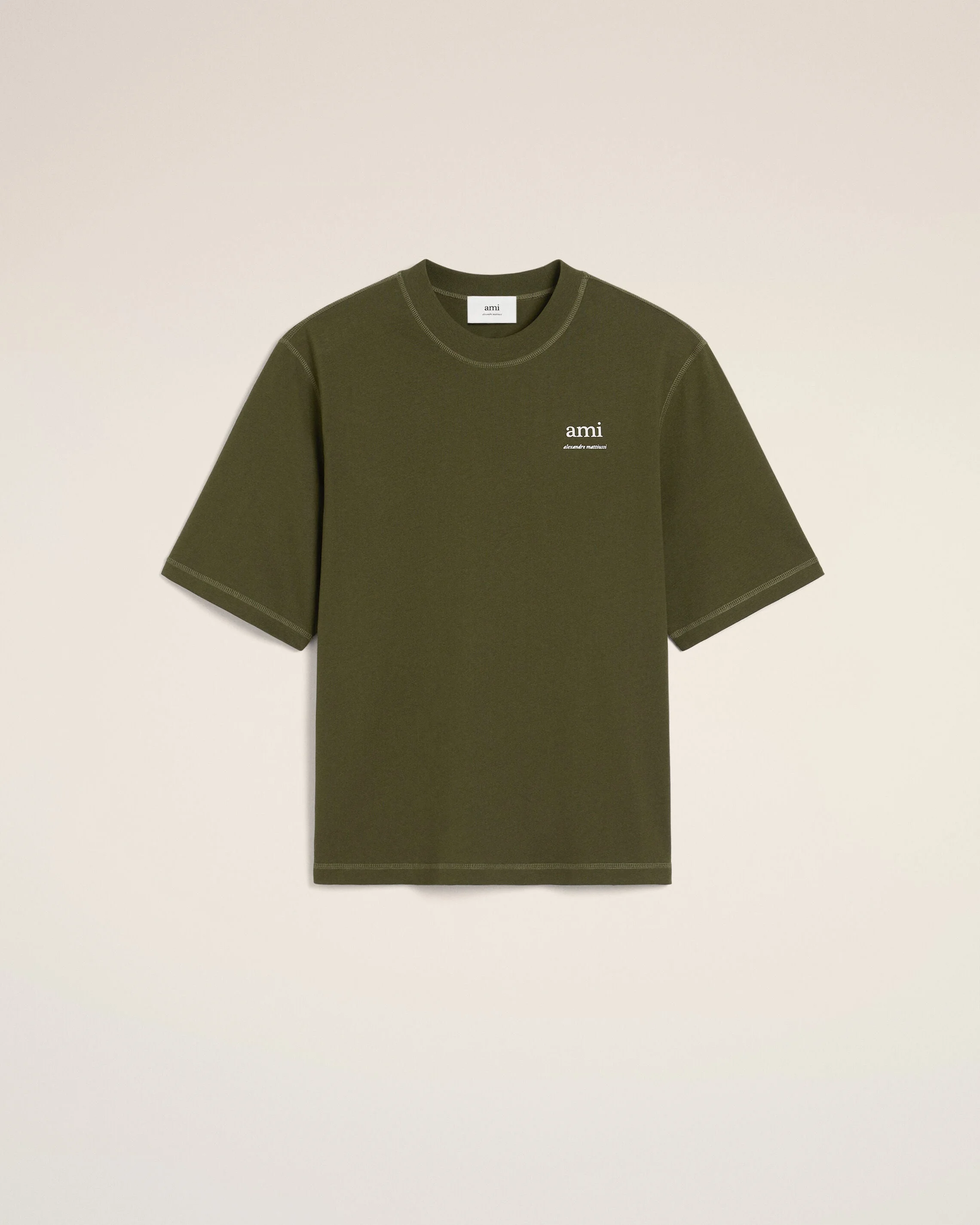 T-shirt ami alexandre mattiussi in cotton jersey. Oversize fit 70 cm center back length (size M) Off-white "ami alexandre mattiussi" print Tonal "ami" under back collar embroidery Made in Portugal (with love) REF: HTS048.JE0119.376 SIZE & FIT This item is designed to be worn lose. Take your normal size. Model is 1m86 / 6'1" and is wearing a size M. COMPOSITION & CARE GUIDE 100% Organic Cotton Chlorine prohibited Machine wash at 30°C gentle Do not tumble dry Cool iron Do not dry clean