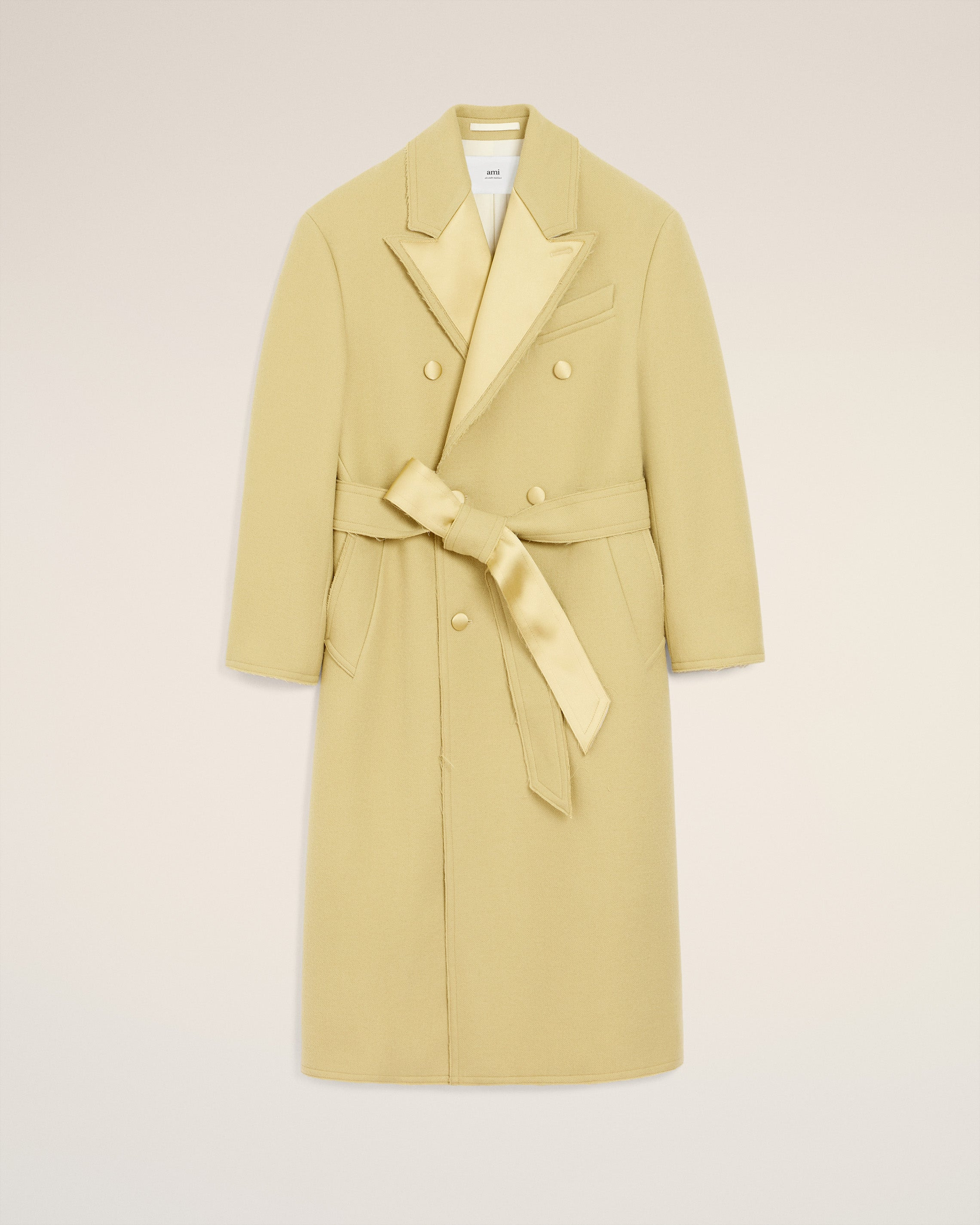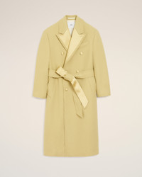 Double breasted tuxedo long coat in boiled wool gabardine. Cosy fit Covered buttons in satin 6 buttons double breasted 1 chest piped pocket 2 diagonal welt pockets 3 inside pockets Raw edge contrasted lapel collar in tone on tone satin Buttoned bottom sleeves Bimaterial removable belt in boiled wool gabardine and satin Slit middle back Fully lined 130 cm center back length (size 36) Made in Moldava (with love) REF: FCO460.WV0078.399 SIZE & FIT This item is designed to be worn lose. Take your normal size. Model is 181 cm / 5"11 and is wearing a size 36. COMPOSITION & CARE GUIDE Main Material : 100% New Wool Secondary Material : 95% Polyester 5% Elastane Body Lining : 50% Polyester 50% Cotton Sleeves Lining : 54% Acetate 45% Viscose 1% Polyester Pocket Lining : 65% Polyester 35% Cotton Do not wash Chlorine prohibited Do not tumble dry Cool iron Dry clean gentle