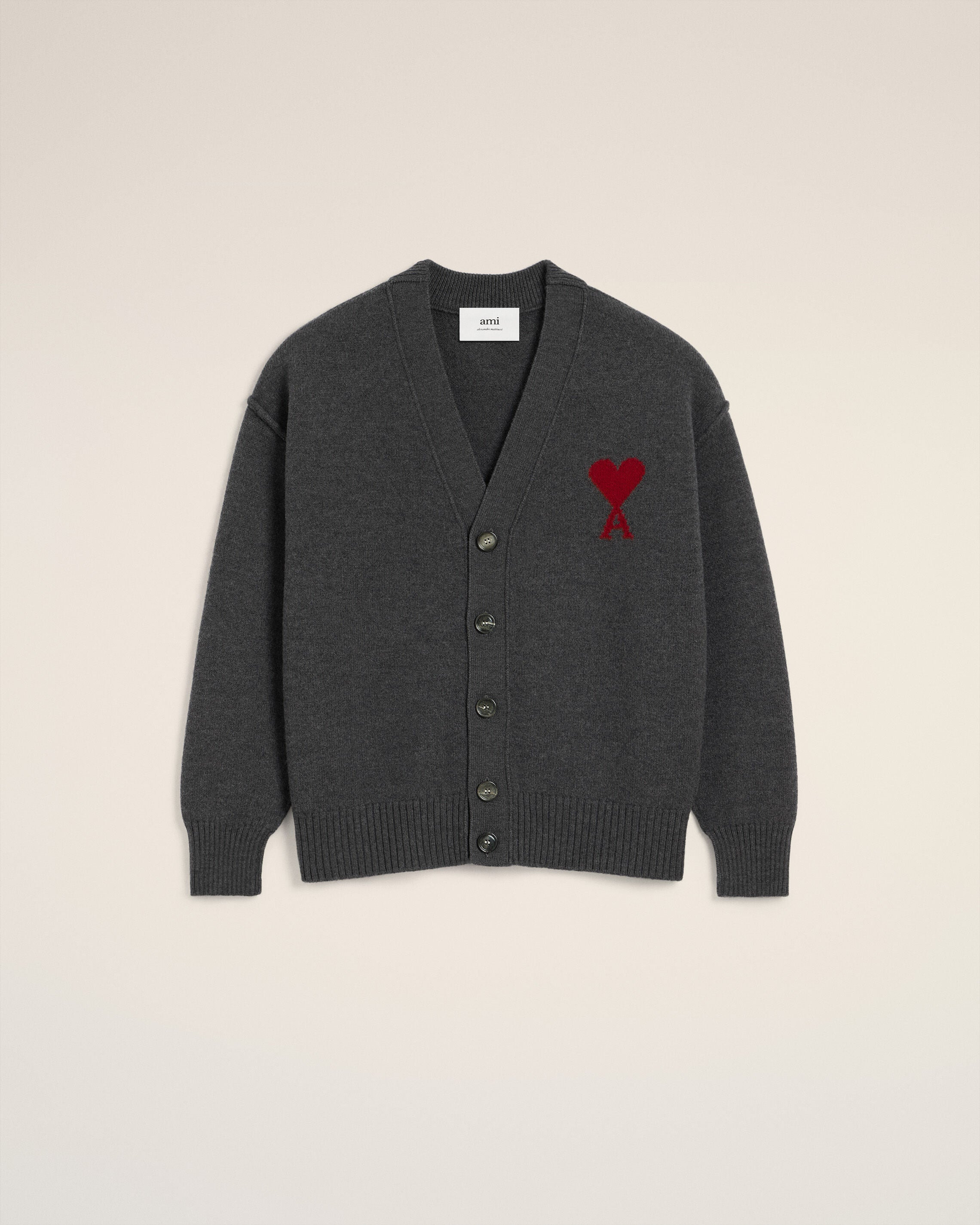 Cardigan in felted merino wool knit. Unisex product "ami" engraved horn buttons Intarsia knitted Ami de Coeur on the chest Inside out seams Jersey stitch 64 cm center back length (size M) 58 cm center back length (size XS) Made in Portugal (with love) REF: UKC367.018.084 SIZE & FIT This style is unisex. For man, take your normal size. For woman, take one size down than your usual size. Man model is 188 cm / 6"2 and is wearing a size M. Woman model is 179 cm / 5"10 and is wearing a size XS. COMPOSITION & CARE GUIDE Main Material : 100% Wool Hand wash low temperature Chlorine prohibited Do not tumble dry Dry flat Cool iron Dry clean possible Contains non-textile parts of animal origin