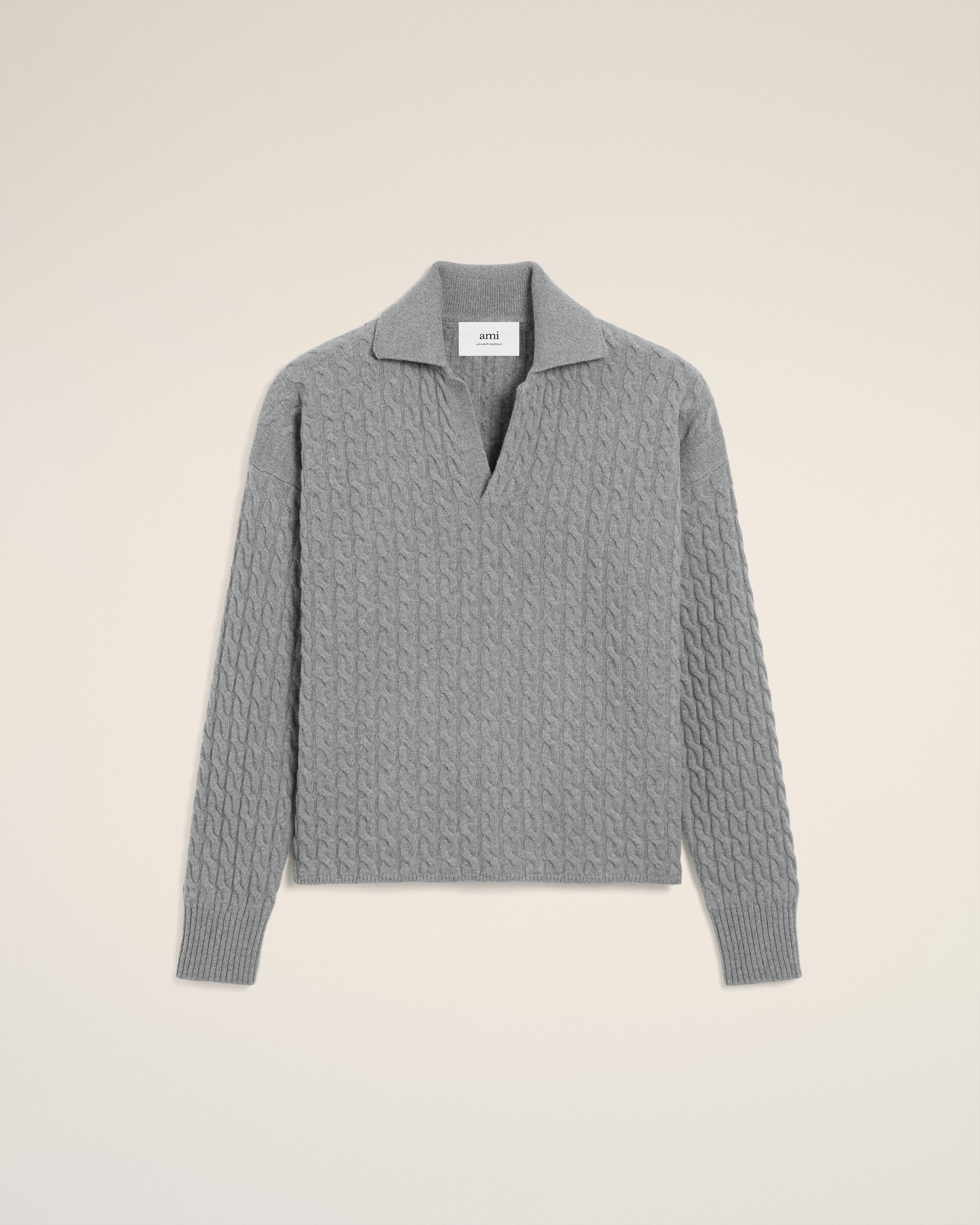 Polo in wool and cashmere cables knit. Unisex product Cable stitch Long sleeves "ami" leather label 64 cm center back length (size M) 58 cm center back length (size XS) Made in Italy (with love) REF: UPL403.KN0104.050 SIZE & FIT This style is unisex. For man, take your normal size. For woman, take one size down than your usual size. Man model is 183 cm / 6"0 and is wearing a size M. Woman model is 181 cm / 5"11 and is wearing a size XS. COMPOSITION & CARE GUIDE Main Material : 90% Wool 10% Cashmere Hand wash low temperature Chlorine prohibited Do not tumble dry Dry flat Cool iron Dry clean gentle Contains non-textile parts of animal origin
