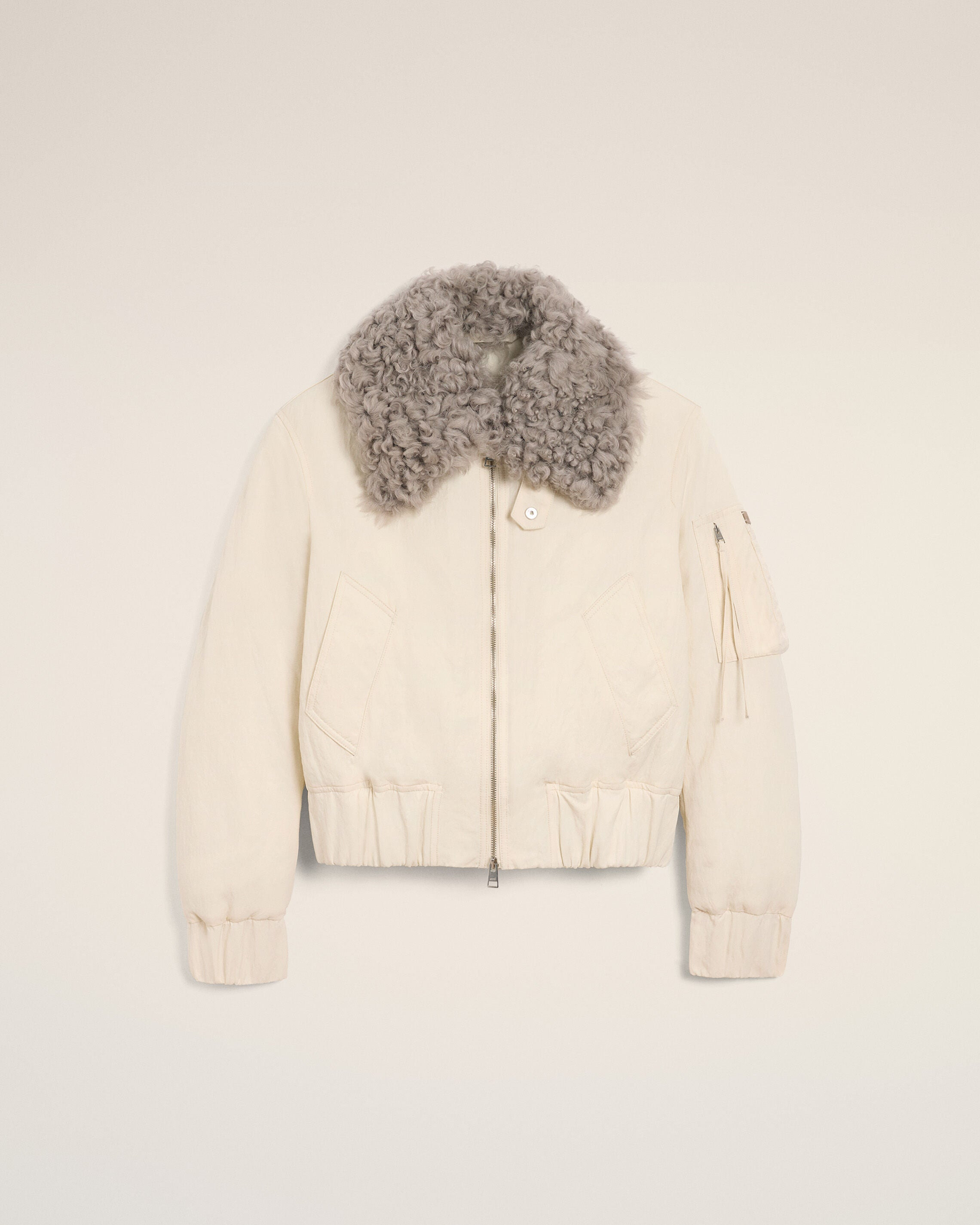 Padded bomber in crinkled nylon serge. Unisex product Removable shearling collar Nickel double metal zipper with "ami" engraved puller Zipped pocket on the sleeve Elasticated cuffs and waist Front and intern pockets with invisible snap buttons "ami alexandre mattiussi" leather label on the sleeve Fully lined and padded Water repellent fabric 57 cm center back length (size XS) 62 cm center back length (size M) Made in Romania (with love) REF: UJK821.PA0035.185 SIZE & FIT This style is unisex. For man, take your normal size. For woman, take one size down than your usual size. Man model is 183 cm / 6"0 and is wearing a size M. Woman model is 177 cm / 5"9 and is wearing a size XS. COMPOSITION & CARE GUIDE Main Material : 100% Polyamide Main Lining : 100% Polyester Collar : 100% Lamb Leather Padding : 100% Polyethylene Pocket Lining : 100% Cotton Do not wash Chlorine prohibited Do not tumble dry Cool iron Dry clean gentle