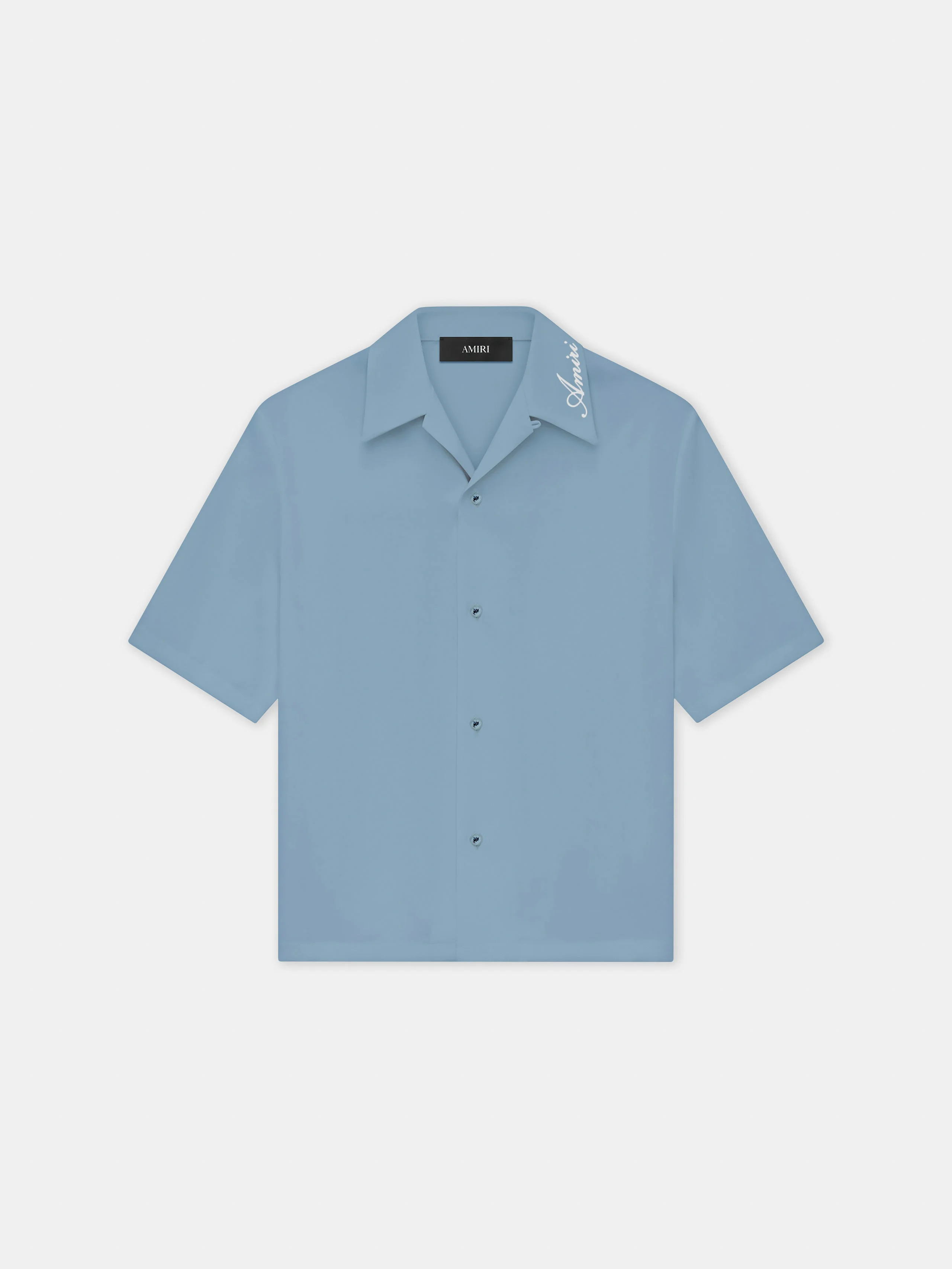 PRE-SPRING 2026 INTRODUCES NEW RENDITIONS OF THE HOUSE SCRIPT LOGO. THE AMIRI CAMP SHIRT IS DESIGNED WITH A NOTCHED COLLAR WITH CONTRAST EMBROIDERY AND FINISHED WITH BUTTONS FEATURING THE MA ICON. PRE-SPRING 2026 COLLECTION MADE IN ITALY 100% POLYESTER THIS GARMENT HAS UNDERGONE A SPECIAL PROCESS WHICH RESULTS IN INTENTIONAL VARIATIONS OF SHADING AND COLOR, AND ADD TO THE PIECE'S UNIQUE CHARACTERISTICS. THIS MAY LEAD TO BLEEDING OR DYE TRANSFER. PLEASE USE CAUTION WHEN WASHING OR DRY-CLEANING THIS ITEM STYLE:AMSTCA1127-856