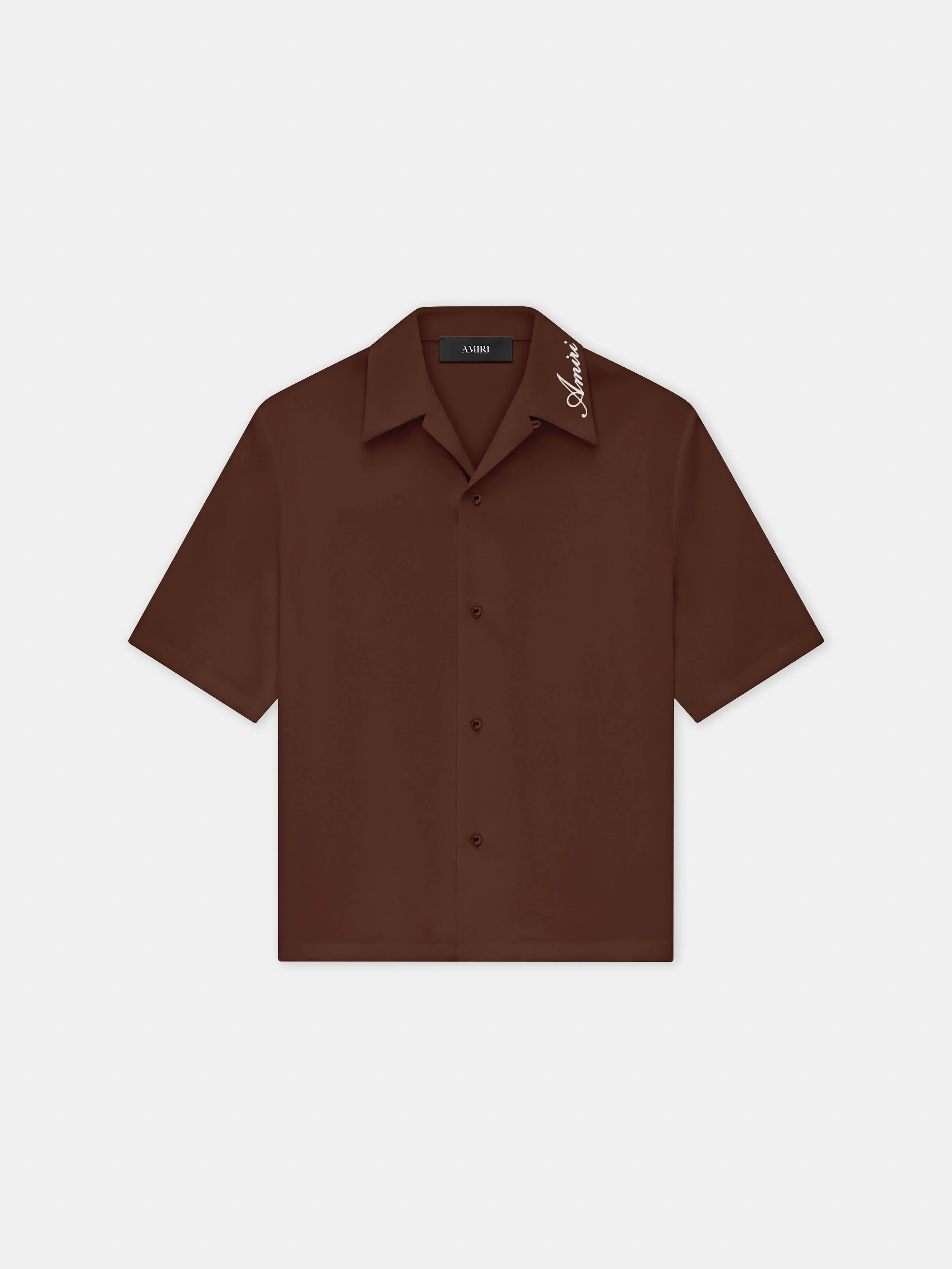 PRE-SPRING 2026 INTRODUCES NEW RENDITIONS OF THE HOUSE SCRIPT LOGO. THE AMIRI CAMP SHIRT IS DESIGNED WITH A NOTCHED COLLAR WITH CONTRAST EMBROIDERY AND FINISHED WITH BUTTONS FEATURING THE MA ICON. PRE-SPRING 2026 COLLECTION MADE IN ITALY 100% POLYESTER THIS GARMENT HAS UNDERGONE A SPECIAL PROCESS WHICH RESULTS IN INTENTIONAL VARIATIONS OF SHADING AND COLOR, AND ADD TO THE PIECE'S UNIQUE CHARACTERISTICS. THIS MAY LEAD TO BLEEDING OR DYE TRANSFER. PLEASE USE CAUTION WHEN WASHING OR DRY-CLEANING THIS ITEM STYLE:AMSTCA1127-234
