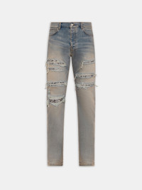 NEW SPECIES COME TO THE FORE FOR PRE-SPRING 2026 WITH PYTHON PRINT, APPEARING IN SIGNATURE DENIM SILHOUETTES. THE AMIRI SNAKE STUD SLIM JEAN IS HAND-DISTRESSED AND FINISHED WITH CLASSIC FIVE-POCKET DETAILING. PRE-SPRING 2026 COLLECTION MADE IN ITALY 92% COTTON, 6% ELASTOMULTIESTER, 2% ELASTANE THIS GARMENT HAS UNDERGONE A SPECIAL PROCESS WHICH RESULTS IN INTENTIONAL VARIATIONS OF SHADING AND COLOR, AND ADD TO THE PIECE'S UNIQUE CHARACTERISTICS. THIS MAY LEAD TO BLEEDING OR DYE TRANSFER. PLEASE USE CAUTION WHEN WASHING OR DRY-CLEANING THIS ITEM STYLE:AMBMJE1015-406 SIZE & FIT MODEL MEASUREMENTS: HEIGHT: 6'1" CHEST: 34.5" WAIST: 26.5" HIP: 34" PRODUCT MEASUREMENTS (SIZE 30): WAIST: 32" RISE: 14.5" HIP: 38" INSEAM: 32"