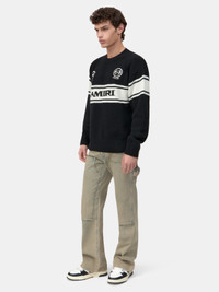 ADAPTED FROM '80S CLASSICS, SPORTSWEAR CANONS ARE ELEVATED THROUGH REFINEMENTS IN FORM AND MATERIAL FOR PRE-SPRING 2026. THE AMIRI SPORT SWEATER IN KNIT COTTON-WOOL IS EMBROIDERED WITH SEASONAL LOGO GRAPHICS AND FINISHED WITH RIB ACCENTS. PRE-SPRING 2026 COLLECTION MADE IN ITALY 85% COTTON, 15% WOOL THIS GARMENT HAS UNDERGONE A SPECIAL PROCESS WHICH RESULTS IN INTENTIONAL VARIATIONS OF SHADING AND COLOR, AND ADD TO THE PIECE'S UNIQUE CHARACTERISTICS. THIS MAY LEAD TO BLEEDING OR DYE TRANSFER. PLEASE USE CAUTION WHEN WASHING OR DRY-CLEANING THIS ITEM STYLE:AMTOKN1005-001 SIZE & FIT MODEL MEASUREMENTS: HEIGHT: 6'2" CHEST: 38.5" WAIST: 30.5" HIP: 37.5"
