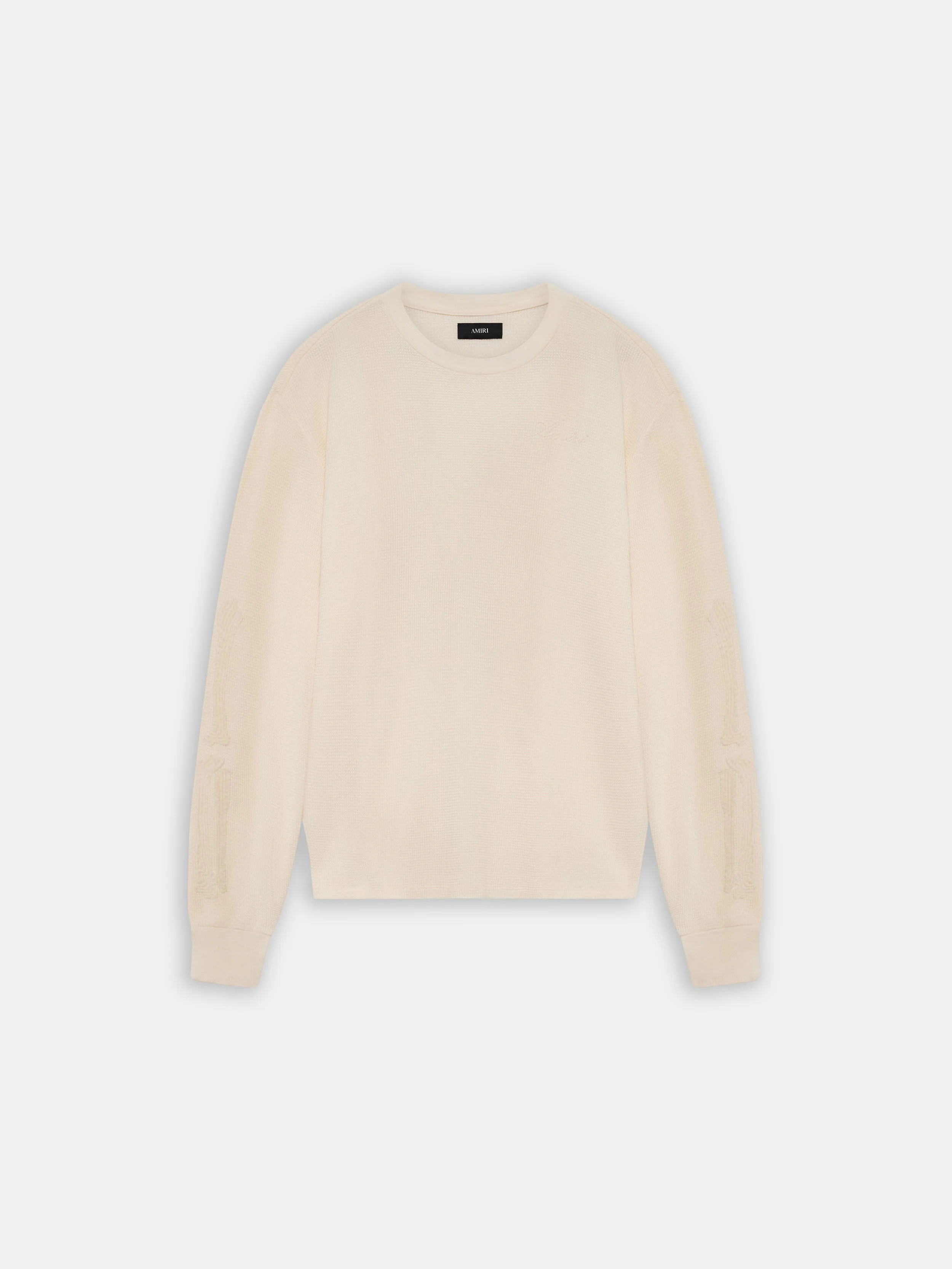THE HOUSE'S SIGNATURE BONES MOTIF ENHANCES COTTON TEES FOR PRE-SPRING 2026. THE BONES LONG SLEEVE TEE IS DESIGNED IN WAFFLE KNIT COTTON AND EMBROIDERED WITH BONE MOTIFS AND THE HOUSE SCRIPT LOGO. PRE-SPRING 2026 COLLECTION MADE IN ITALY 100% COTTON THIS GARMENT HAS UNDERGONE A SPECIAL PROCESS WHICH RESULTS IN INTENTIONAL VARIATIONS OF SHADING AND COLOR, AND ADD TO THE PIECE'S UNIQUE CHARACTERISTICS. THIS MAY LEAD TO BLEEDING OR DYE TRANSFER. PLEASE USE CAUTION WHEN WASHING OR DRY-CLEANING THIS ITEM STYLE:AMTOJR1032-127 SIZE & FIT MODEL MEASUREMENTS: HEIGHT: 6'1" CHEST: 34.5" WAIST: 26.5" HIP: 34" PRODUCT MEASUREMENTS (SIZE M): CHEST: 22" SHOULDER: 18.5" LENGTH: 28" SLEEVE LENGTH: 27"