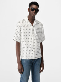HOUSE SIGNATURE MOTIFS FORM NEW PATTERNS THROUGH A PLAY IN SCALE. THE MIX AND MATCH MA SHIRT IN LIGHTWEIGHT SILK FEATURES AN MA ICON PRINT AND IS FINISHED WITH A CLASSIC NOTCHED LAPEL AND BUTTON-DOWN CONSTRUCTION. CORE COLLECTION MADE IN ITALY 100% SILK STYLE:AMSTBW1020-100 SIZE & FIT MODEL IS WEARING SIZE "M" MODEL MEASUREMENTS: HEIGHT: 6'3 CHEST: 34.5" WAIST: 29" HIP: 36" PRODUCT MEASUREMENTS: CHEST: 44" SHOULDER: 18" LENGTH: 27.5" SLEEVE LENGTH: 12.5"
