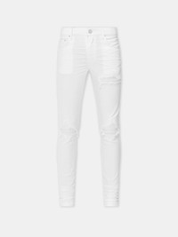DENIM BECOMES A CANVAS FOR INTRICATE FABRICATION PROCESSES THAT EMBODY THE HOUSE'S SPIRIT OF CONTEMPORARY INNOVATION AND CRAFT. THE MX1 IN ITALIAN STRETCH DENIM IS HAND-DISTRESSED AND REPAIRED WITH PLEATED LEATHER AND FINISHED WITH CLASSIC FIVE-POCKET DETAILING. PRE-FALL 2024 COLLECTION MADE IN USA 48% LYOCELL, 24% ORGANIC COTTON, 22% MODAL, 4% ELASTOMULTIESTER, 2% ELASTANE, CONTRAST: 100% LEATHER