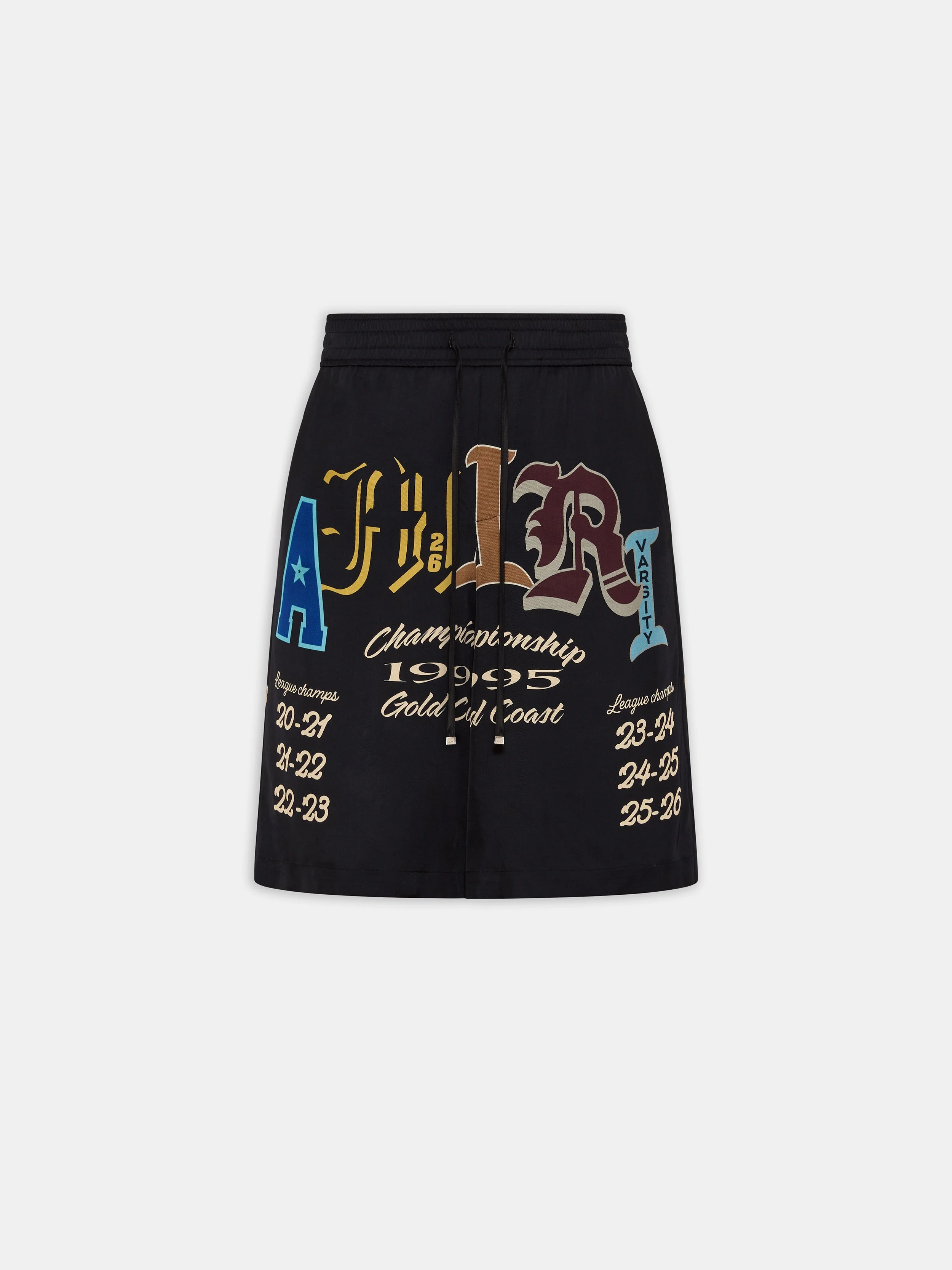THE PRE-SPRING 2026 MENSWEAR COLLECTION REIMAGINES VINTAGE COLLEGIATE ICONOGRAPHY THROUGH A HOUSE SIGNATURE LENS. THE VARSITY PATCH SHORT IS DESIGNED WITH SIDE SEAM POCKETS AND AN ELASTIC WAISTBAND WITH DRAWCORD. PRE-SPRING 2026 COLLECTION MADE IN ITALY 100% VISCOSE THIS GARMENT HAS UNDERGONE A SPECIAL PROCESS WHICH RESULTS IN INTENTIONAL VARIATIONS OF SHADING AND COLOR, AND ADD TO THE PIECE'S UNIQUE CHARACTERISTICS. THIS MAY LEAD TO BLEEDING OR DYE TRANSFER. PLEASE USE CAUTION WHEN WASHING OR DRY-CLEANING THIS ITEM STYLE:AMBMSO1028-001 SIZE & FIT MODEL MEASUREMENTS: HEIGHT: 6’2” CHEST: 35.5" WAIST: 28" HIP: 34.5"