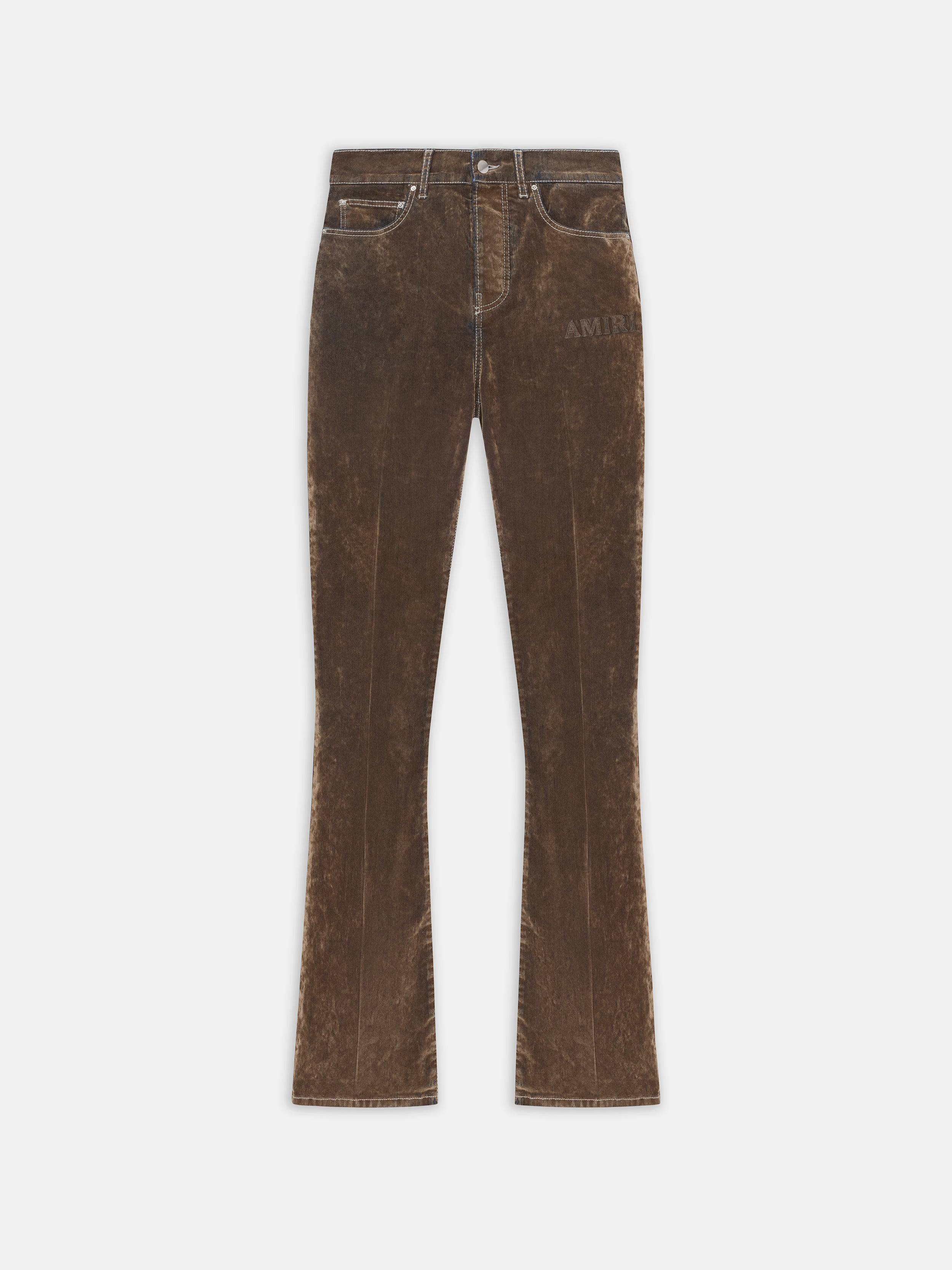 LUSH VELVET IMBUES HOUSE SIGNATURE SILHOUETTES WITH THE SPIRIT OF ELEVATED LEISURE FOR AUTUMN-WINTER 2025. THE VELVET FLARE JEAN IS DESIGNED WITH CREASED FRONT AND BACK DETAILING AND FINISHED WITH LOGO EMBROIDERY AND CONTRAST TOPSTITCHING. AUTUMN-WINTER 2025 COLLECTION MADE IN ITALY 67% COTTON, 21% POLYESTER, 2% ELASTANE, 4% VISCOSE, 6% POLYURETHANE THIS GARMENT HAS UNDERGONE A SPECIAL PROCESS WHICH RESULTS IN INTENTIONAL VARIATIONS OF SHADING AND COLOR, AND ADD TO THE PIECE'S UNIQUE CHARACTERISTICS. THIS MAY LEAD TO BLEEDING OR DYE TRANSFER. PLEASE USE CAUTION WHEN WASHING OR DRY-CLEANING THIS ITEM STYLE:AMDNFR1027-281 SIZE & FIT MODEL MEASUREMENTS: HEIGHT: 6’1.5" CHEST: 36.5" WAIST: 28" HIP: 36" PRODUCT MEASUREMENTS (SIZE 30): WAIST: 31.75" RISE: 11.75" HIP: 39.75" INSEAM: 32"