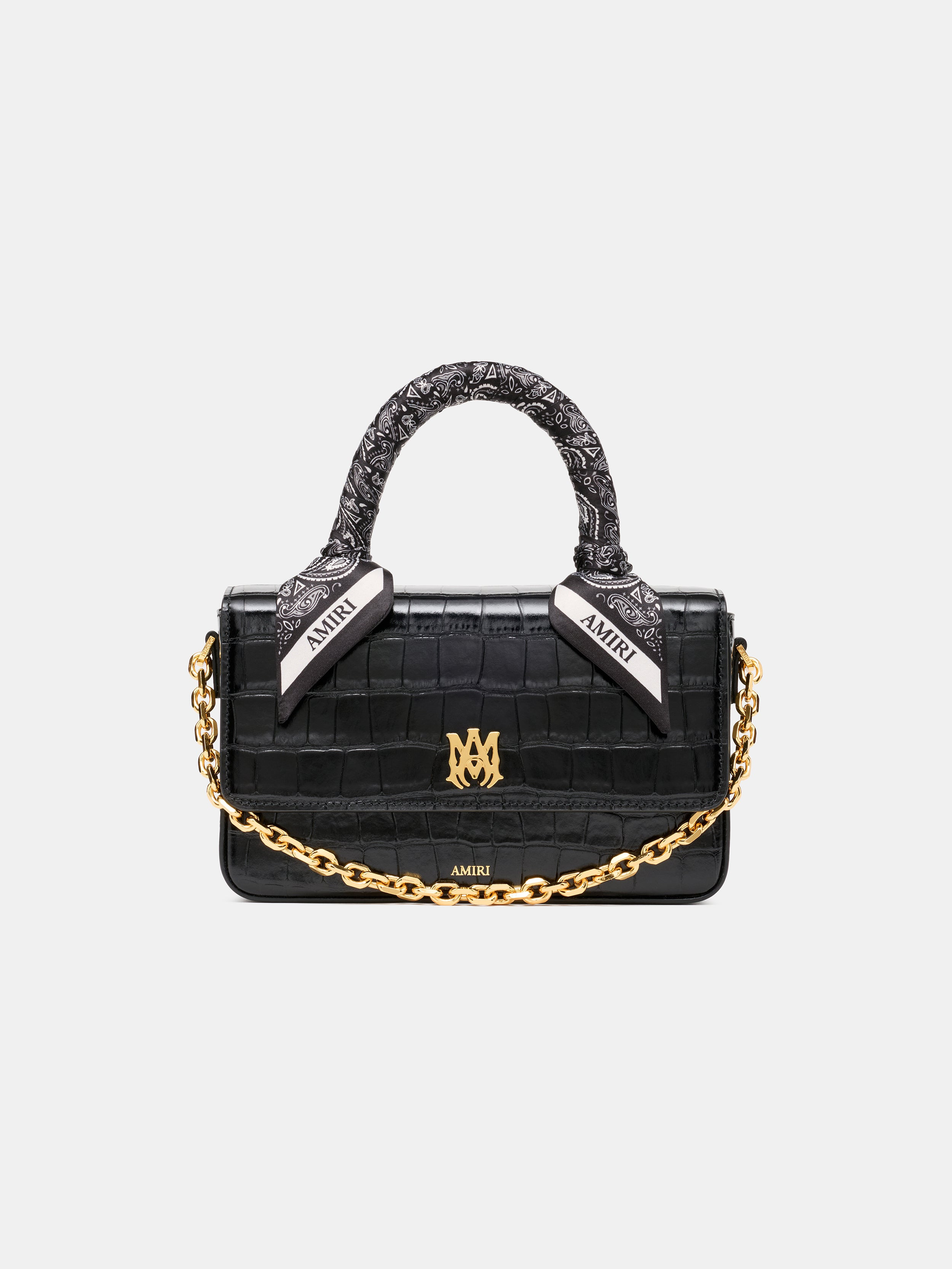 TACTILE CROC-EMBOSSED LEATHER ENHANCES AN ELONGATED RENDITION OF THE ICONIC MA BAG FOR AUTUMN-WINTER 2025. THE CROC EMBOSSED LONG MA BAG IS FINISHED WITH MA ICON HARDWARE, A TOP HANDLE WITH TIED PAISLEY SCARF ACCENTS, A CHAIN HANDLE, AND A DETACHABLE CROC-EMBOSSED SHOULDER STRAP. AUTUMN-WINTER 2025 COLLECTION MADE IN ITALY 100% LEATHER EACH PIECE IS METICULOUSLY CRAFTED AND INHERENTLY UNIQUE. SLIGHT VARIATIONS IN THE ARTWORK ARE A NATURAL RESULT OF THE PRINTING PROCESS AND CONTRIBUTE TO THE DISTINCTIVE CHARACTER OF THIS PRODUCT. STYLE:AWBGTH1073-001 SIZE & FIT PRODUCT MEASUREMENTS: WIDTH: 8.66" HEIGHT: 5" DEPTH: 2.36"