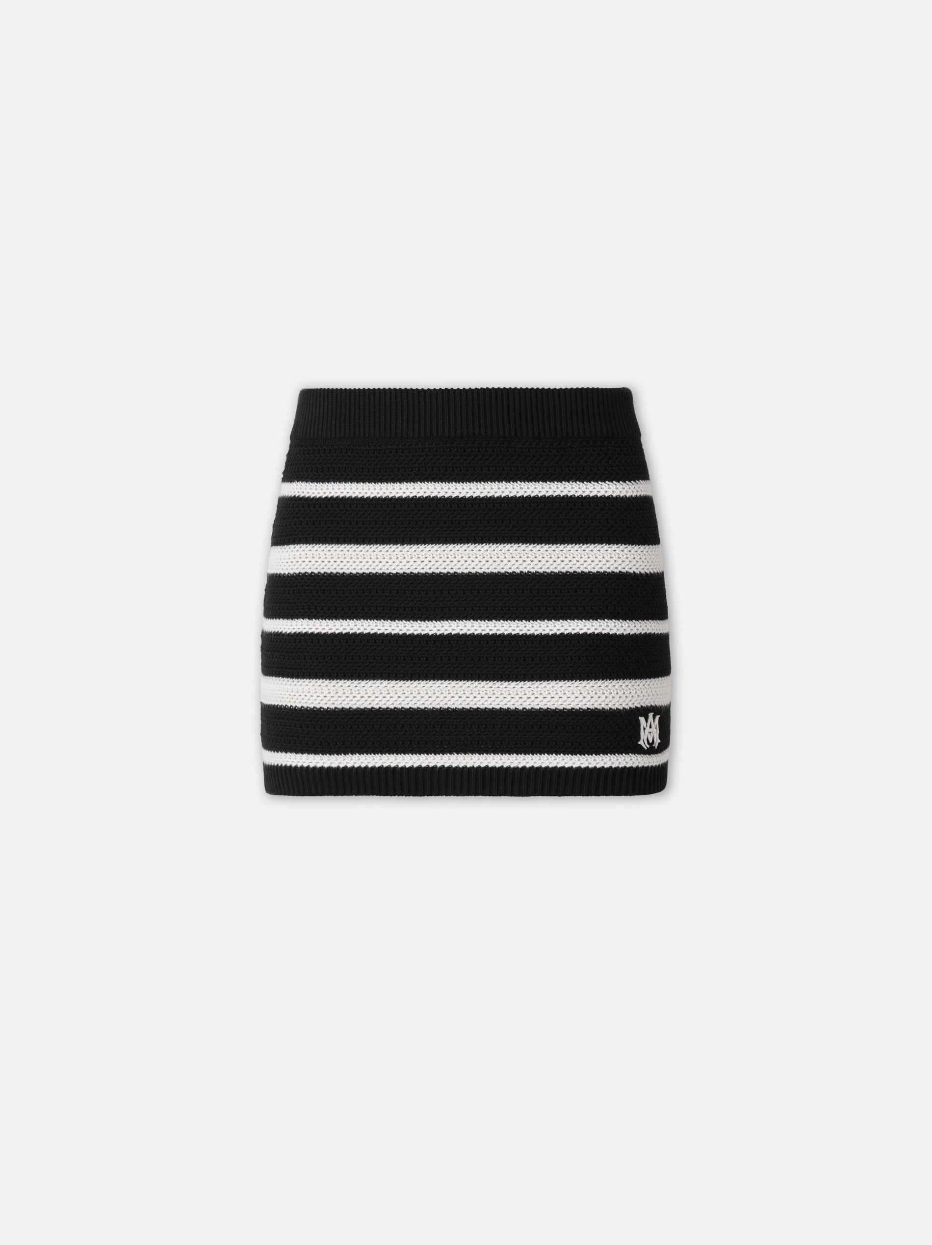 THE SEASON'S KNIT STRIPE APPEARS IN A SLIM-FIT SKIRT FOR PRE-SPRING 2025. THE MA STRIPED MINI SKIRT IS DESIGNED IN KNIT EGYPTIAN COTTON AND FINISHED WITH THE EMBROIDERED MA ICON AND FINE RIB ACCENTS. PRE-SPRING 2025 COLLECTION MADE IN ITALY 100% EGYPTIAN COTTON STYLE:AWKNKR1014-001 SIZE & FIT PRODUCT MEASUREMENTS (SIZE “XS”): WAIST: 26" HIP: 15.75" LENGTH: 12.5"