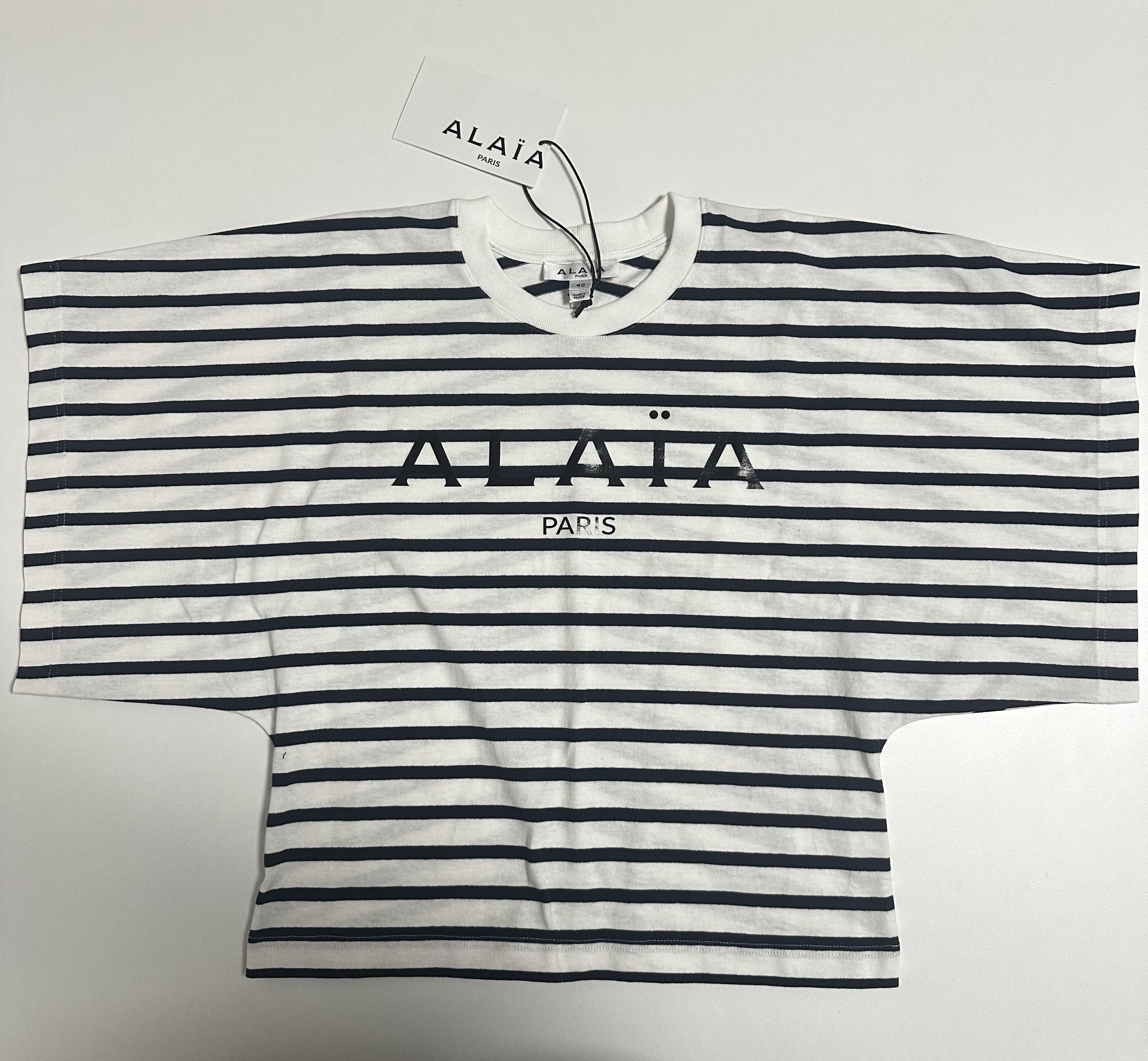 Alaïa White Crop Striped T-shirt - Size 40 FR - Sailor Blue Marine stripes - 100% Cotton Jersey Made in France - Rib knit crewneck - Logo printed at front - Loose fit and batwing sleeves. - DS Conditions, never used with brand tag - Measurements : width 73cm - lenght 52cm #alaia #top #TShirt #fashion #fashion2025 #stripes