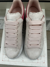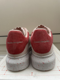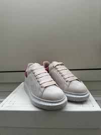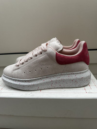 Alexander Mcqueen Suede Oversized Sneakers - Size 37 - Cream trainers with a pink foiled-logo heel counter and upper of soft suede, then set on a retro specked midsole. - Spray effect on outsole - DS Conditions, dust bag and box included - Retail price 620€ #alexandermcqueen #McQueen #sneakers #sneakerstyle #oversize #oversized #trainers