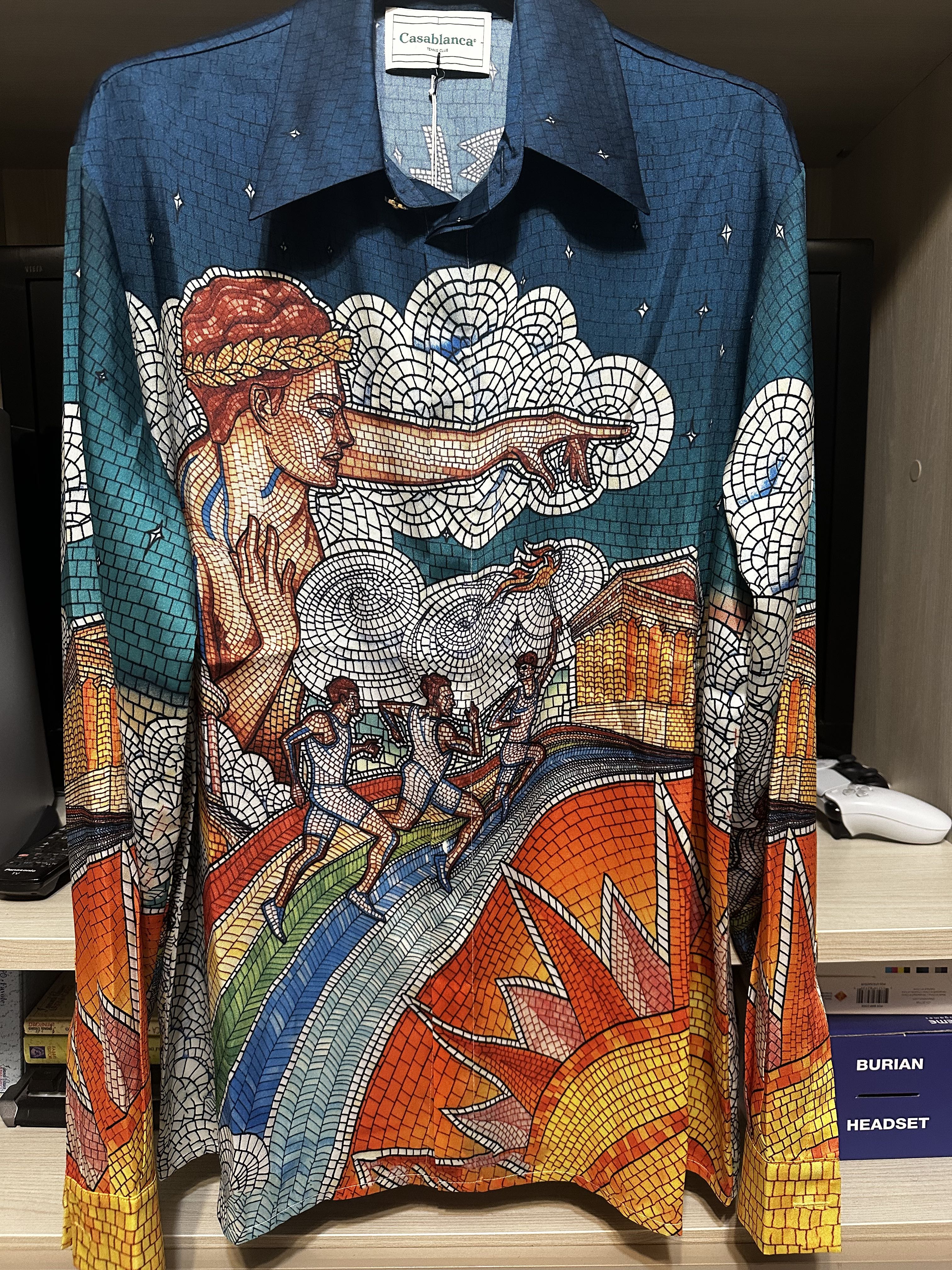Casablanca Jeux de l’Uni Shirt - Size XL - White/multicolour silk satin weave all-over graphic print - Logo print to the rear - Classic collar front button fastening - Long sleeves buttoned cuffs - Curved hem - Composition : Silk 100% - Measurements : lenght 75cm - chest 46cm - sleeves 65cm - shoulders 50cm #casablanca #shirt #shirts #90shirt #fashion #print