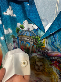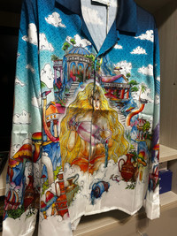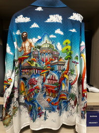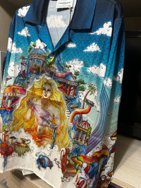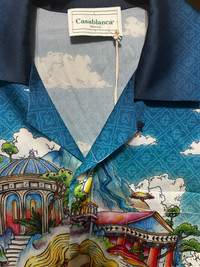 Casablanca The Road to Knowledge Shirt - Silk twill shirt - Size M - Front covered button placket • Cuban collar • Long sleeves, signature gold-rim pearl button cuffs • Patch chest pocket • 100% Silk • Made in Italy • Retail price 875€ • Measurements : lenght 72cm - chest 44cm - sleeves 64cm - shoulders 47cm #casablanca #shirt #silk #fashion #summer