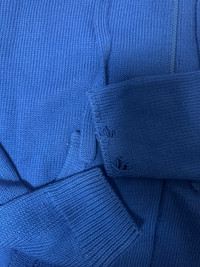 Off-White Zip Knitted Hoodie - One Size - Blue full-zip hoodie features circular black logos on both sleeves with the text "OFF WHITE" repeated in a pattern. - It has a full zipper closure with a ring pull tab and two front pockets. - Ribbed knit fabric - Oversize fit, wide and long sleeves - Made in Italy - Used but in great conditions - Measurements : lenght 68cm - chest 69cm - sleeves 65cm - shoulders 67cm #offwhite #OffWhiteArrows #blue #knitwear #hoodie #zipper #streetwear