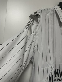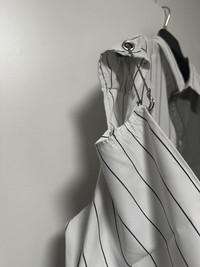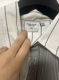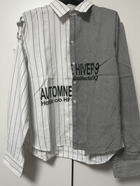 Honja c/o HF AH19 Oversize Collection Shirt - Size M/L - Elegant oversize double fabric shirt made of premium cotton. - Relaxed, loose fit with slightly elongated sleeves and an open shoulder with custom oversize safety pin to attach it together. - Used conditions - Measurements : lenght 72cm - shoulders 50cm - sleeves 65cm - chest 48cm #fashion #fashion2025 #design #designerfashion #Brand #emerging #shirt #stripes