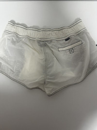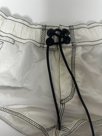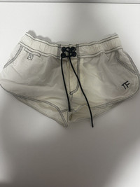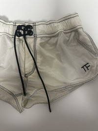 Tom Ford Shorts - Size 38 - Adjustable black drawstring closure. Contrasting stitching - Side pockets, small welt pocket on the back with contrasting logo lining - Black TF logo print on the left leg - Colour: chalk white - 100% Polyamide - Made in Italy - DS condition, never used - Retail price 700€ #tomford #fashion #shorts #tfh