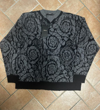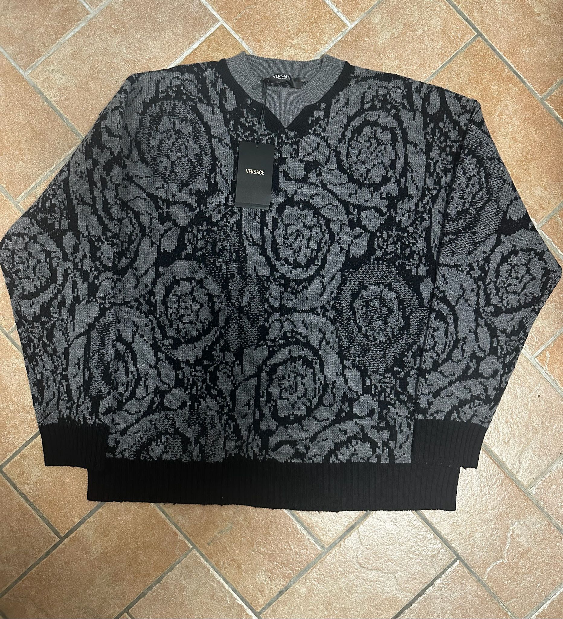 Versace Barocco Knit Sweater - Size 54 - Crewneck intarsia wool jumper, black and grey wool with a bold jacquard Barocco pattern - Ribbed cuffs and hem - Retail price 950€ - DS Conditions, new with brand tag - Measurements : lenght 70cm - shoulders 50cm - chest 57cm - sleeves 68cm