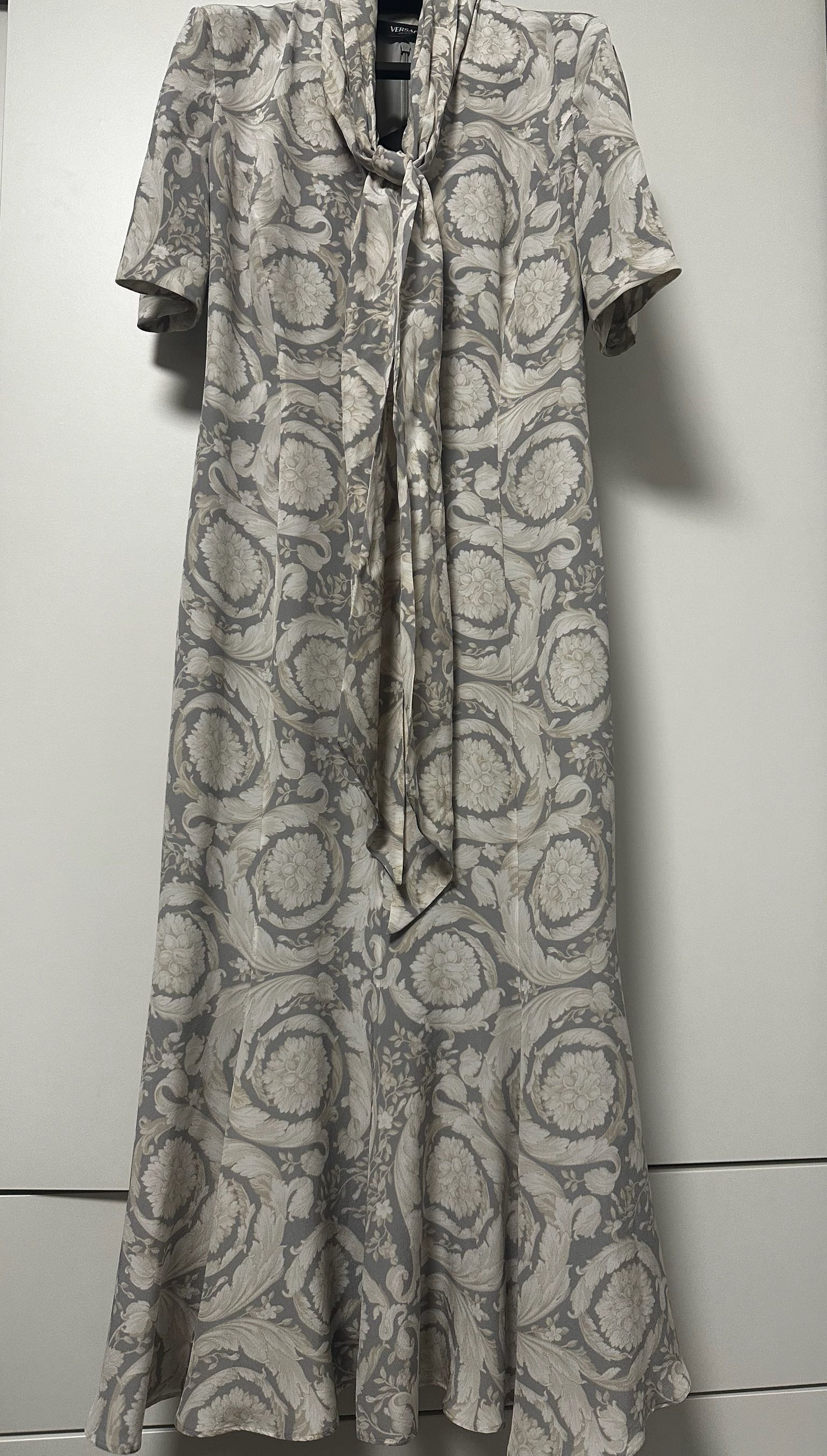 Versace Barocco Lavallière Midi Dress - Size 40 - Blue-grey/cream white - Signature Barocco print, with scarf detailing and keyhole neck - Concealed rear zip fastening, fitted waistline, straight hem - 100% Silk - DS conditions, never used with brand tag - Retail price 2.590€ - Measurements : lenght 114cm - pit-to-pit 44cm - width hem 75cm