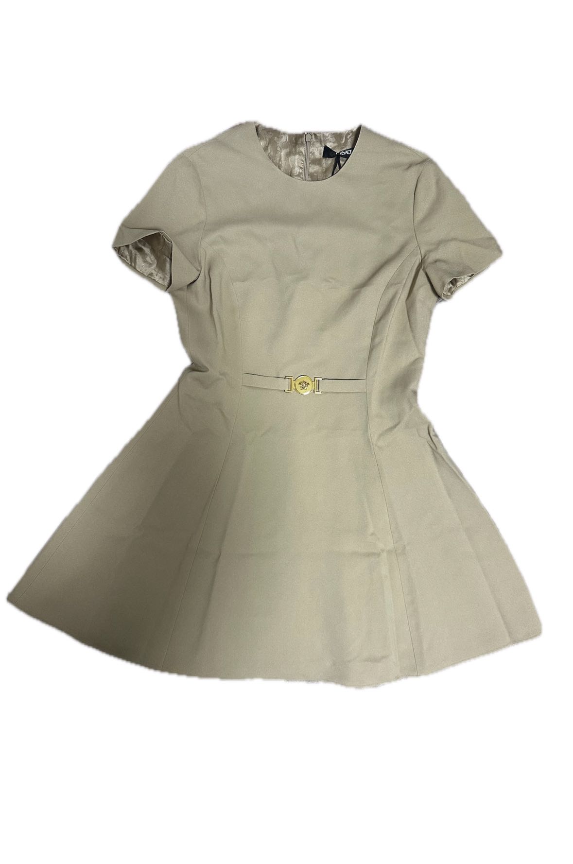 Versace Beige Medusa ‘95 Mini Dress - Size 46 - Crafted from stretch cady fabric, the dress offers both comfort and a flattering fit - The design is elevated by the iconic Medusa '95 hardware and accented with the distinctive nastro Gianni detail at the front. - Viscose sablè fabric - Retail price 1.780€ - DS Conditions, new with brand tag - Measurements : 91cm - chest 48cm - shoulders 37cm