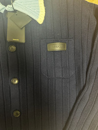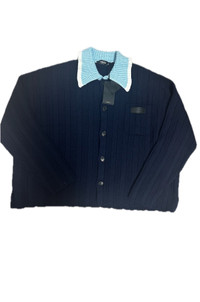 Versace Blue Knit Cardigan - Size 58 - Contrasting blue navy collar knitted shirt - Handcrafted from pure wool, with a thick-ribbed finish, a knitted classic collar contrasts with a navy blue construction - A minimalistic black leather tag found on the chest elevated this long-sleeved top - Drop shoulder, long sleeves, straight hem - Retail price 1.390€ - DS Conditions, new with brand tag - Measurements : lenght 65cm - sleeves 55cm - chest 68cm - shoulders 68cm