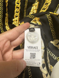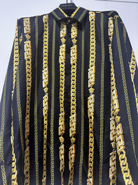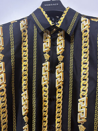 Versace Chain Printstripe Silk Shirt - Size 50 - Black & Gold All-over print - Classic collar, first gold button, long sleeves, regular fit, no pockets - 100% Silk - Retail price 1.580€ - DS conditions, never used with brand tag - Measurements : lenght 73cm - chest 55cm - shoulder 49cm - sleeves 63cm #versace #versaceWallet #versace2025 #versaceShirt #black #gold #print #iconic #chain #shirt #menshirt #mensfashion #menstyle #fashion