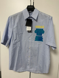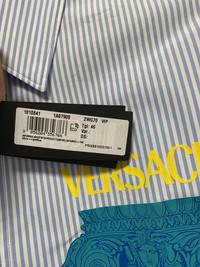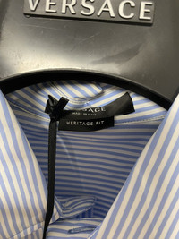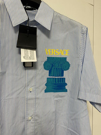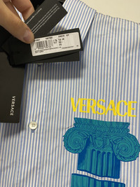Versace La Colonna Shirt - Size 46 - Striped cotton in light blue - Colonna print chest - Heritage fit, true to size - 100% Cotton - DS Conditions, new with brand tag - Measurements : lenght 71cm - sleeves 27cm - chest 42cm - shoulders 47cm #versace #versace2025 #v2versace #shirt #mensfashion #menstyle #fashionstyle #stripes